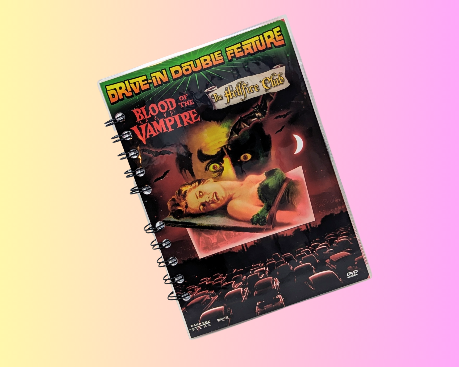 • Carnet de film DVD Blood of the Vampire, The Hellfire Club réalisé à partir d'une feuille de DVD vintage recyclée.