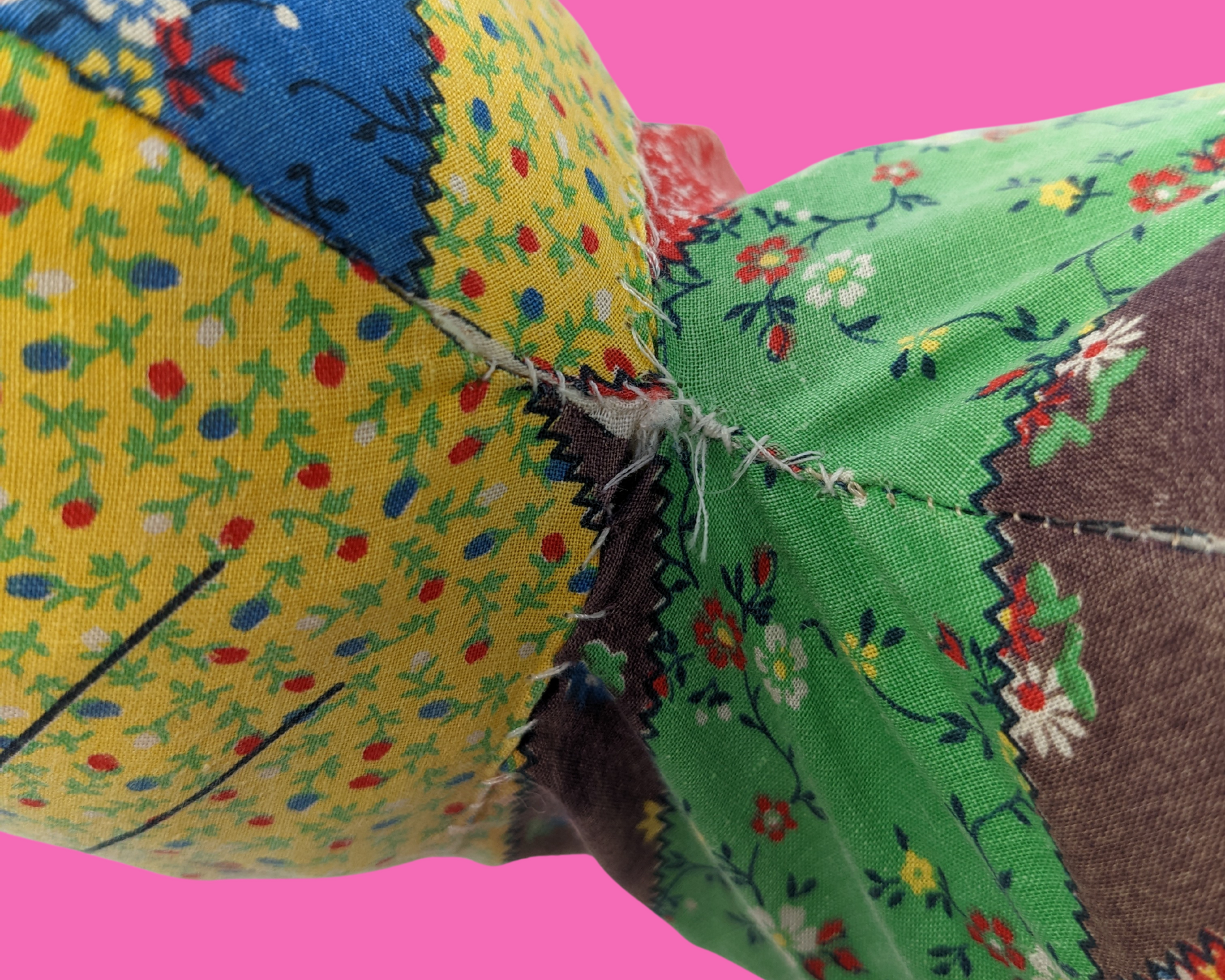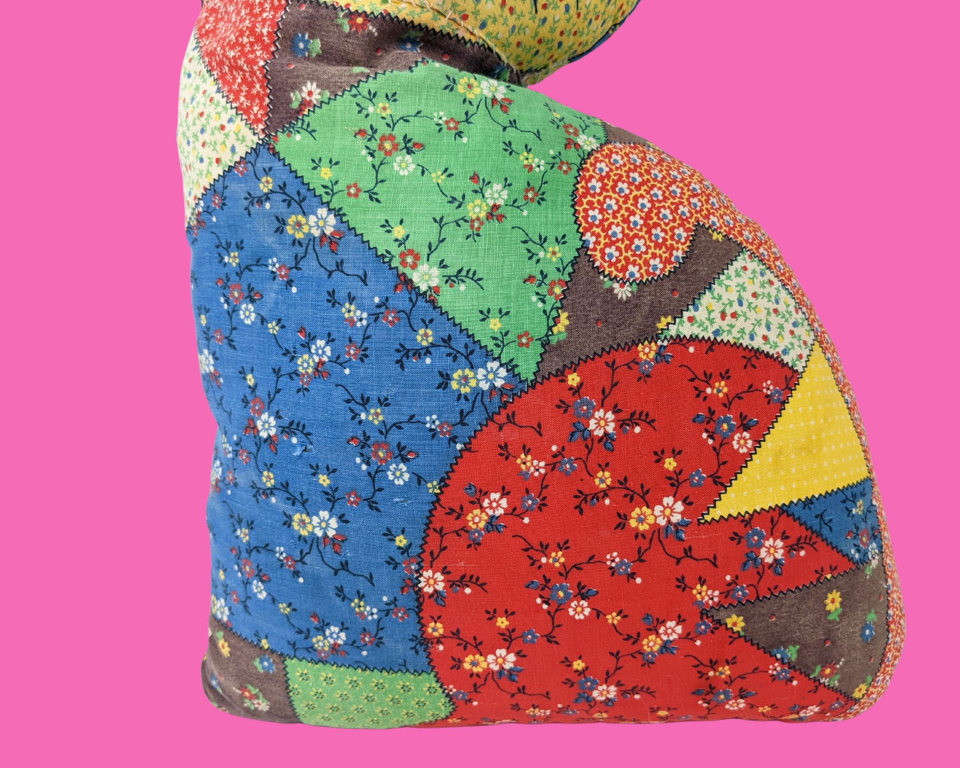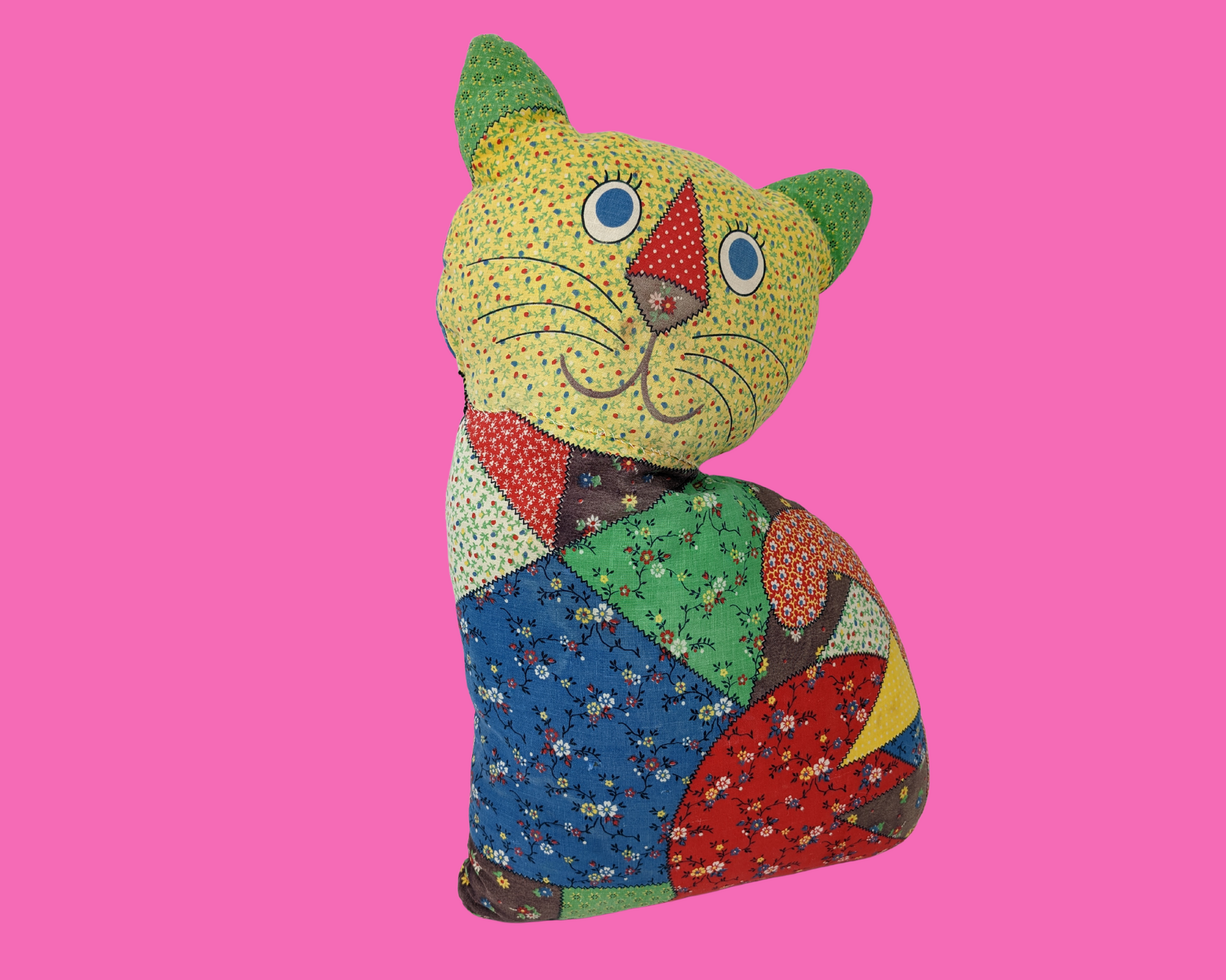 Coussin décoratif chat patchwork en peluche vintage des années 1970