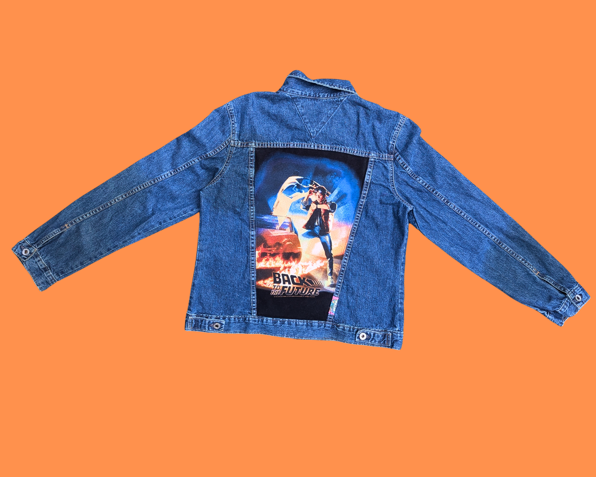 • Handmade, Upcycled Back to the Future Light Denim Jacket Size L