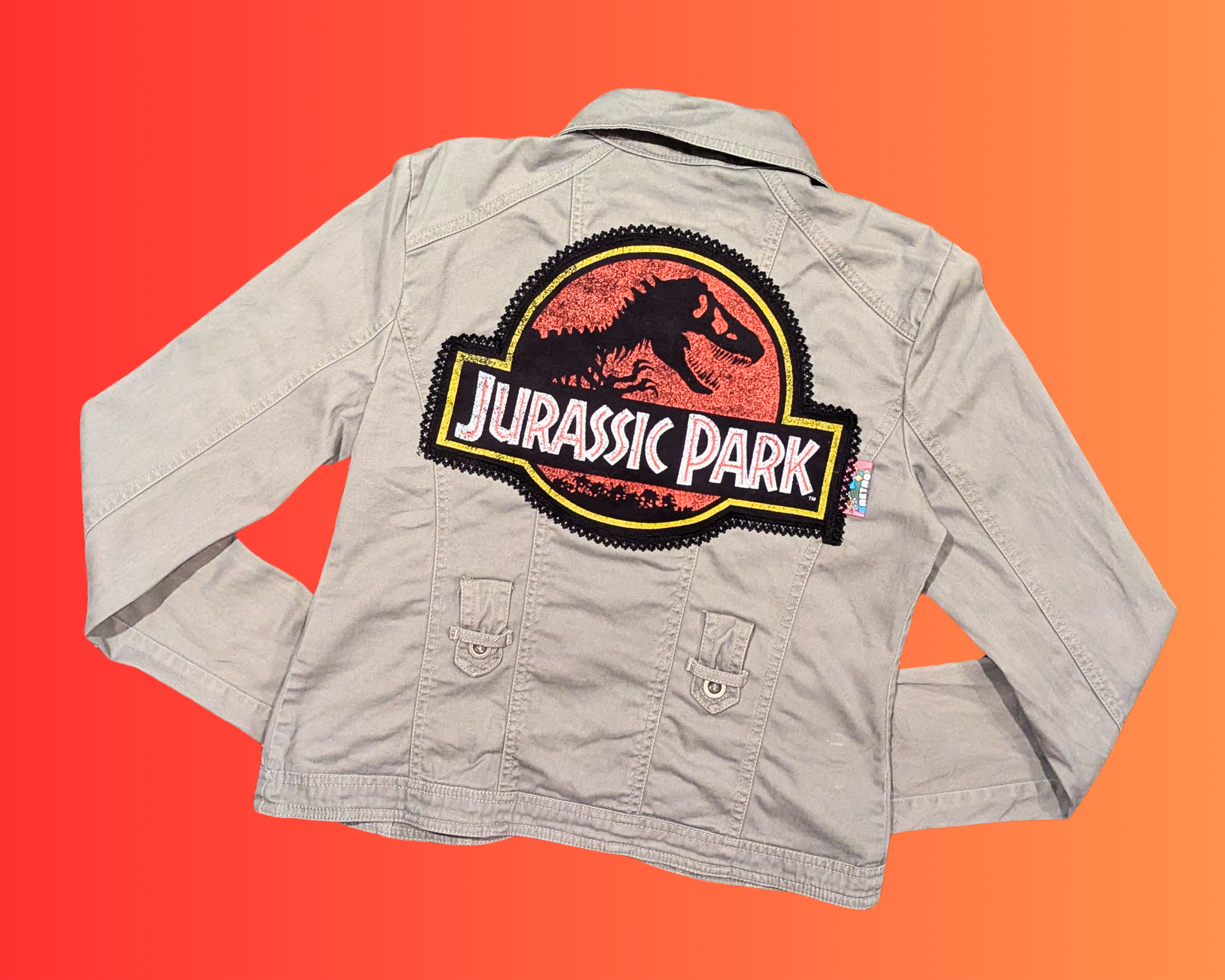 • Handmade, Upcycled Gray, Jurassic Park Denim Jacket Size M