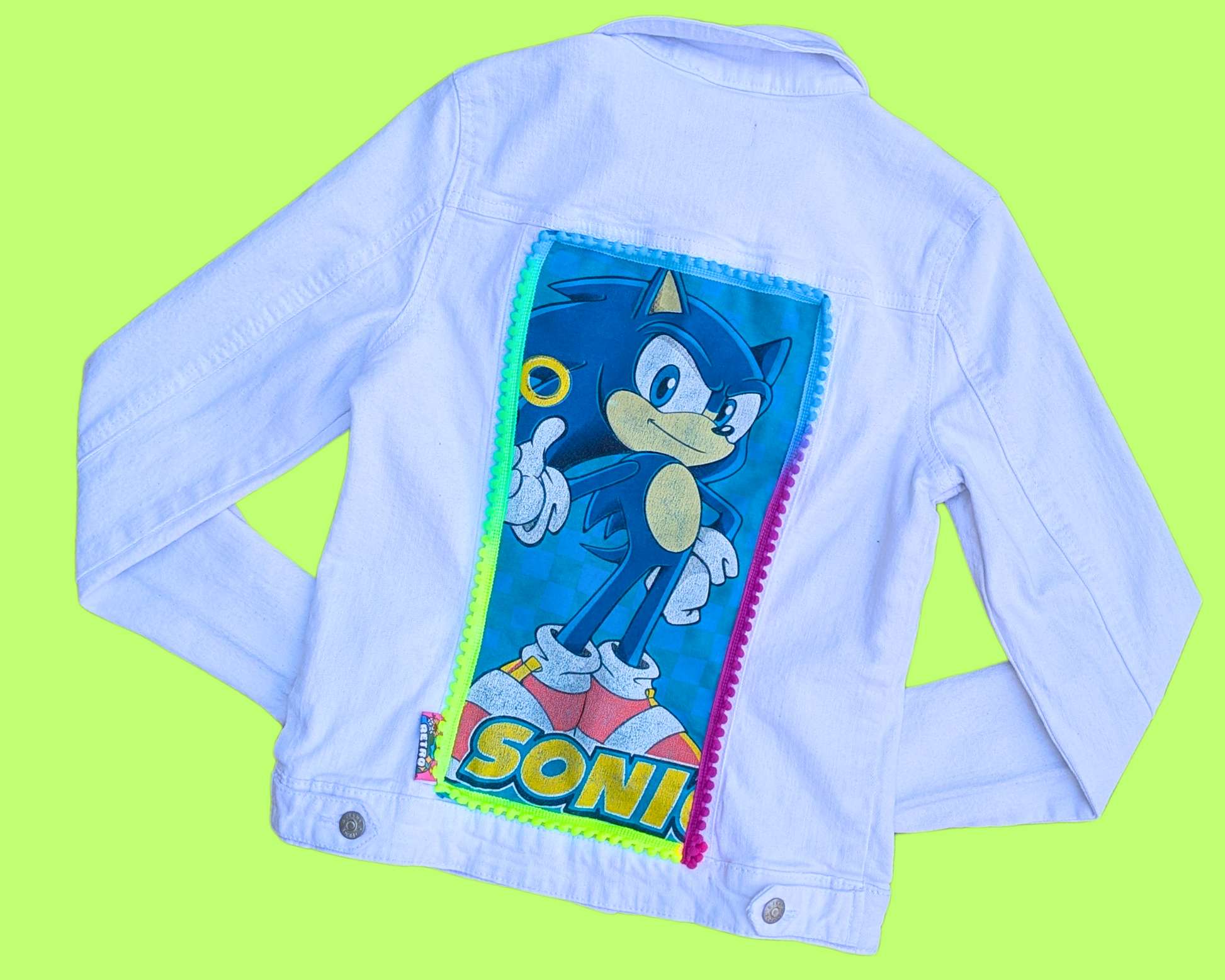 • Veste en jean blanche Sonic The Hedgehog faite à la main et recyclée, taille XS