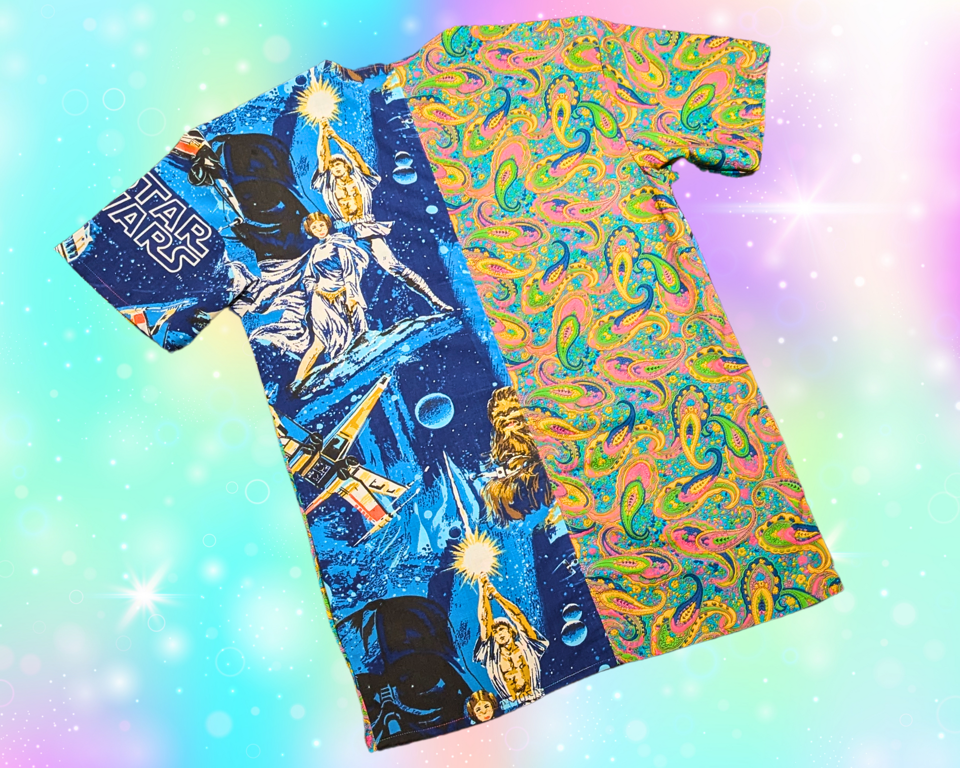 Drap de lit Star Wars fait main et recyclé + robe t-shirt en tissu groovy des années 1960, taille S