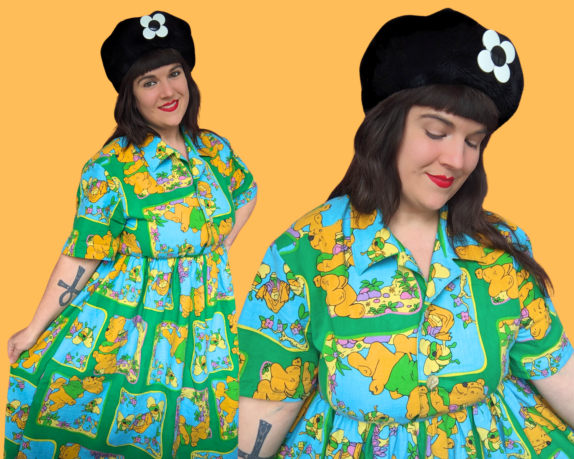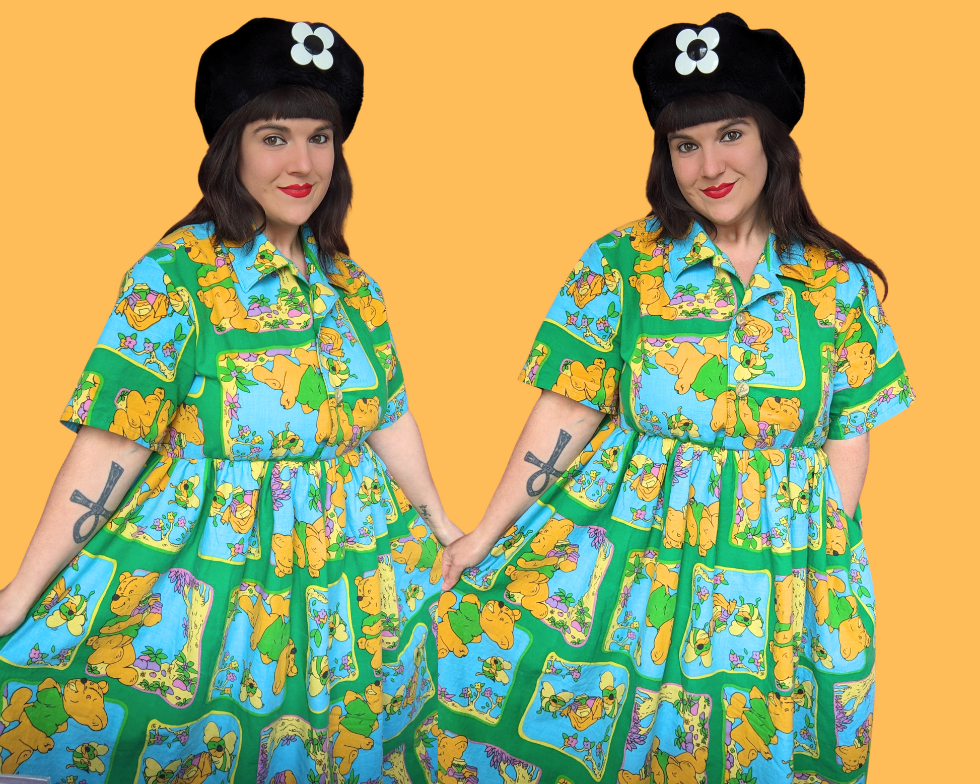 Robe chemise boutonnée Winnie l'ourson, drap de lit fait main et recyclé, taille L-XL