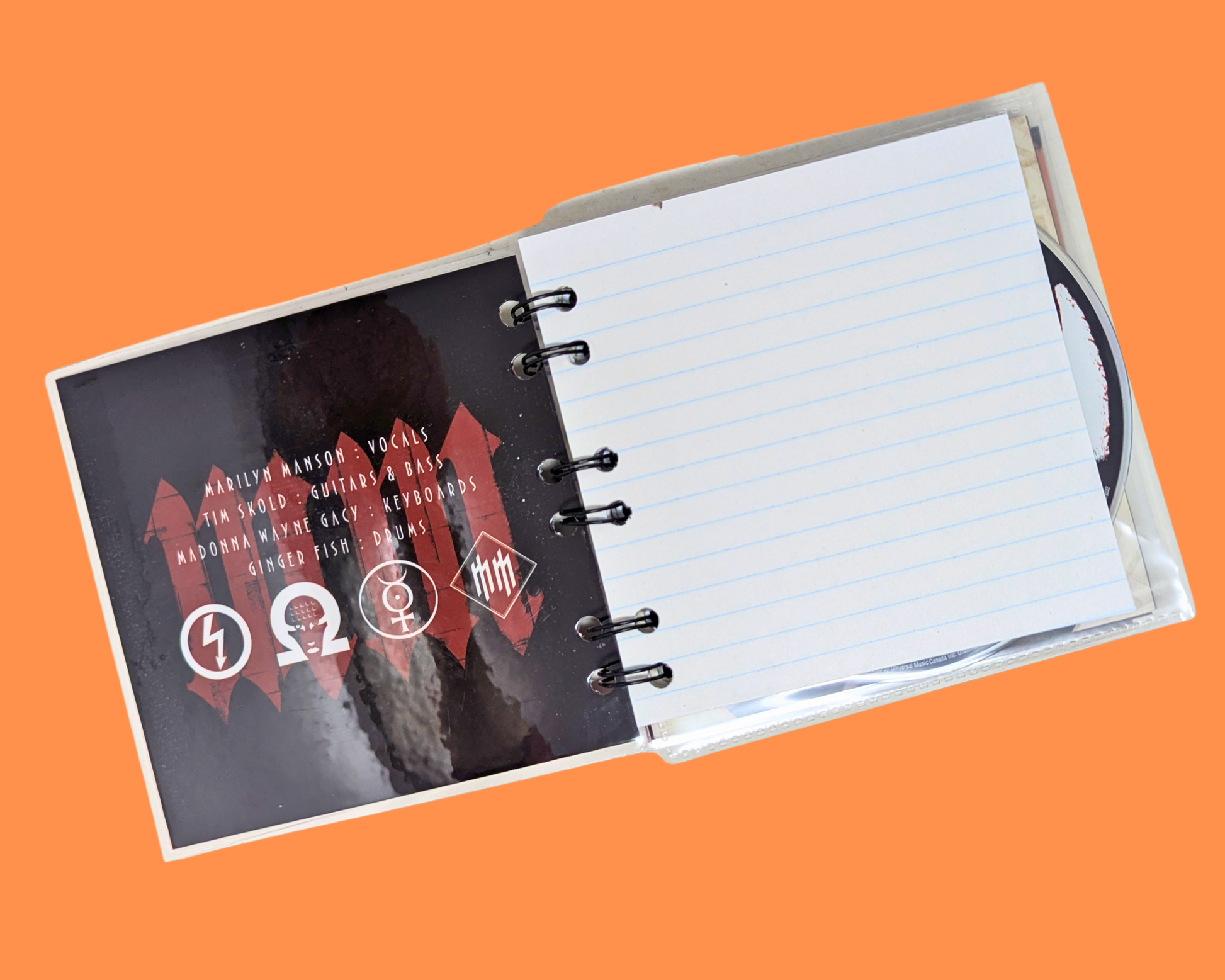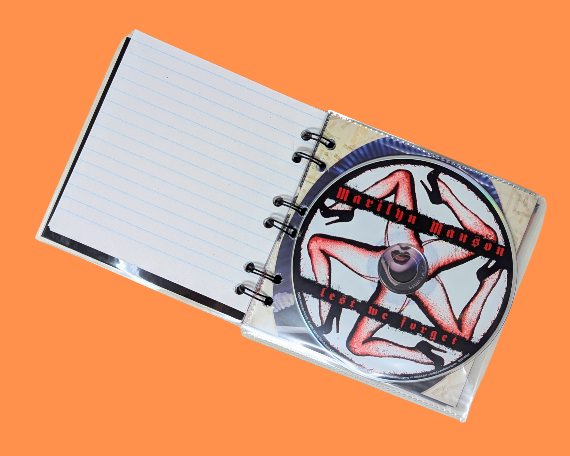 • Marilyn Manson, Lest We Forget The Best Of Carnet CD réalisé à partir d'une pochette et d'une couverture de CD recyclées.