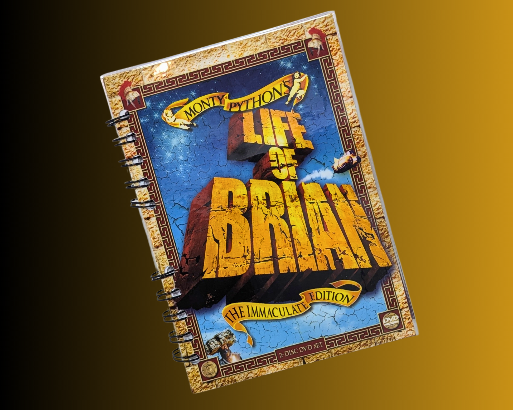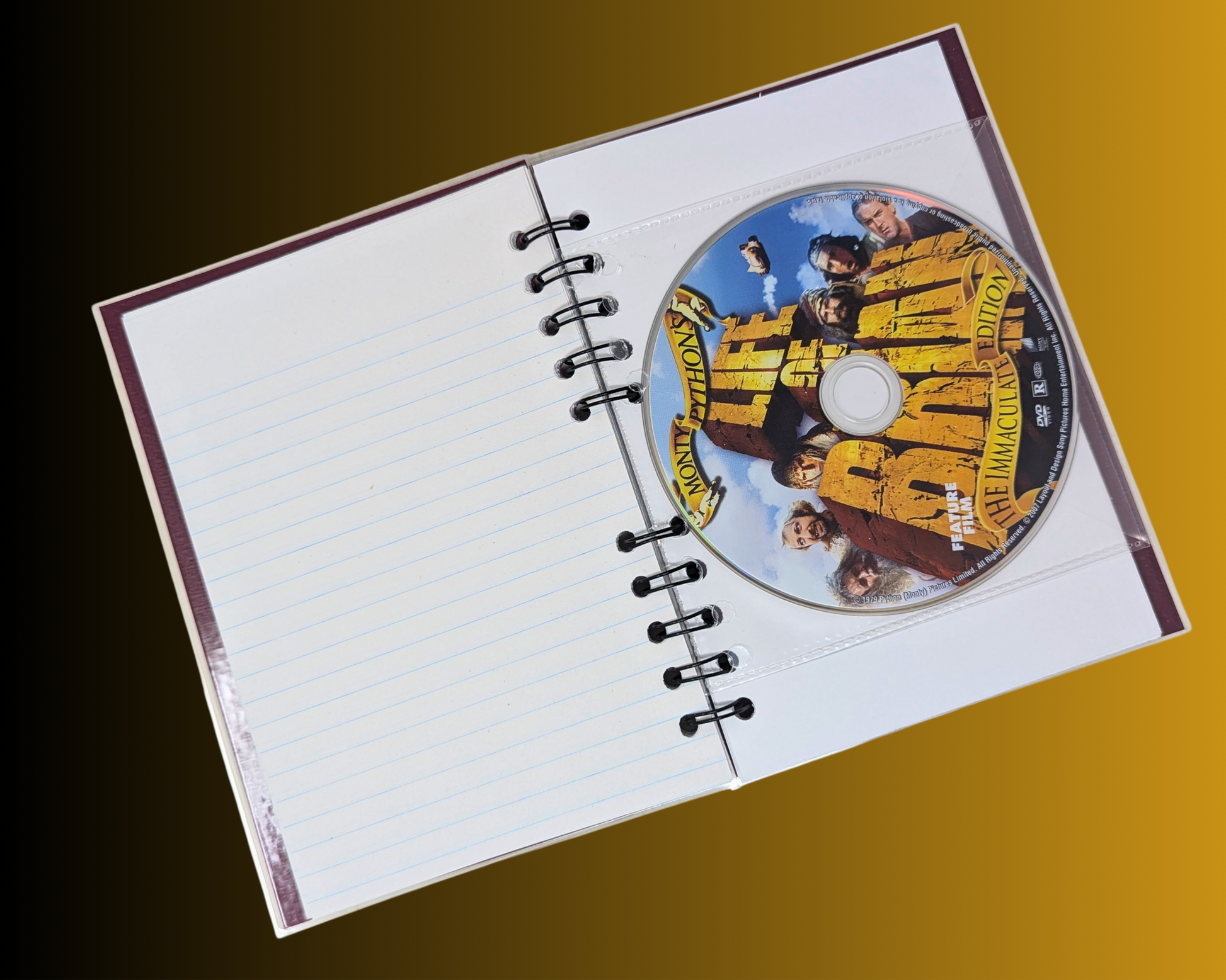 • Carnet de notes du film DVD La vie de Brian de Monthy Python réalisé à partir d'une feuille de DVD vintage recyclée.