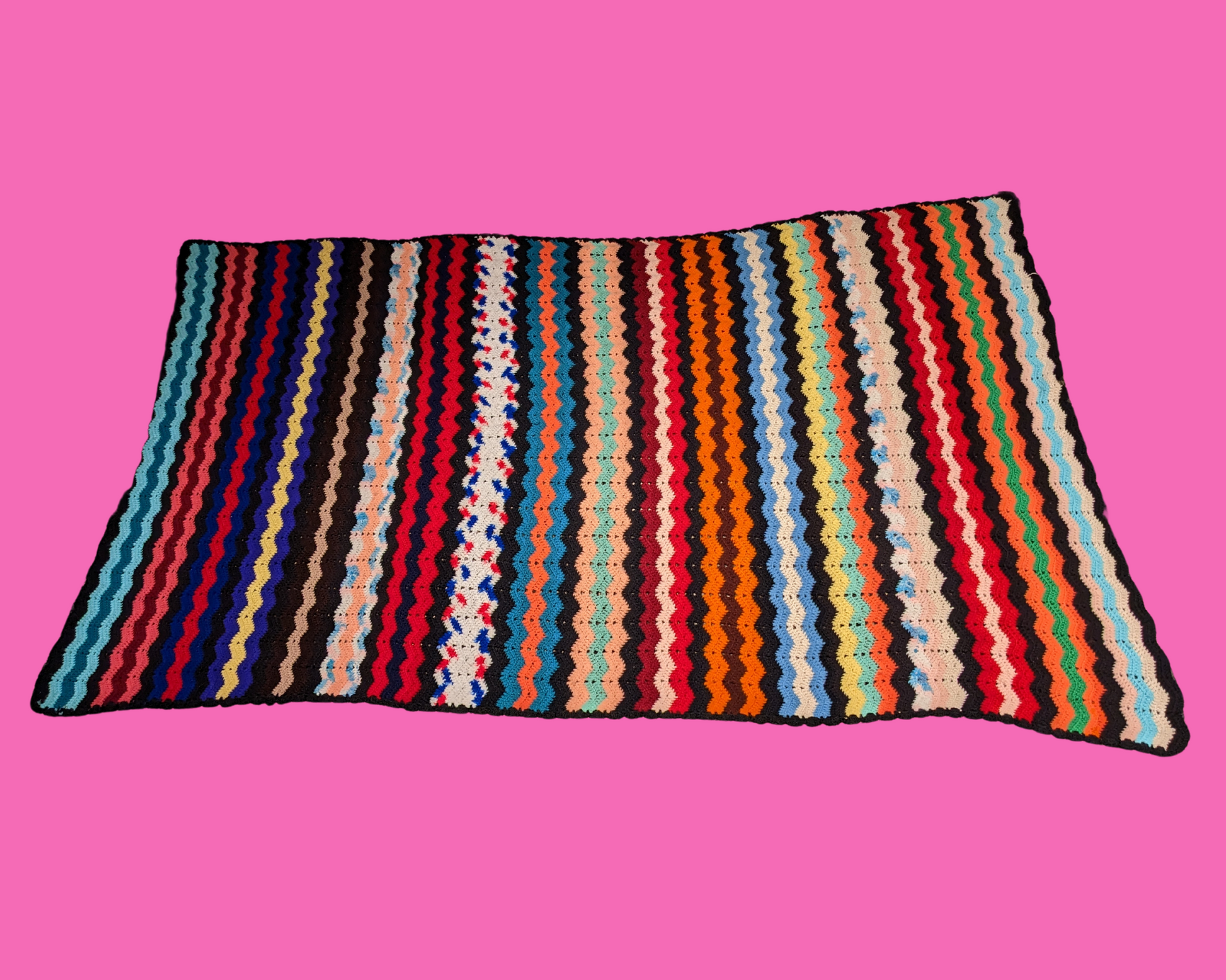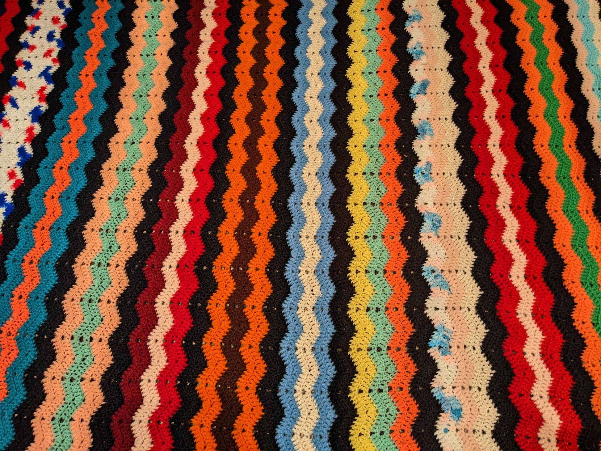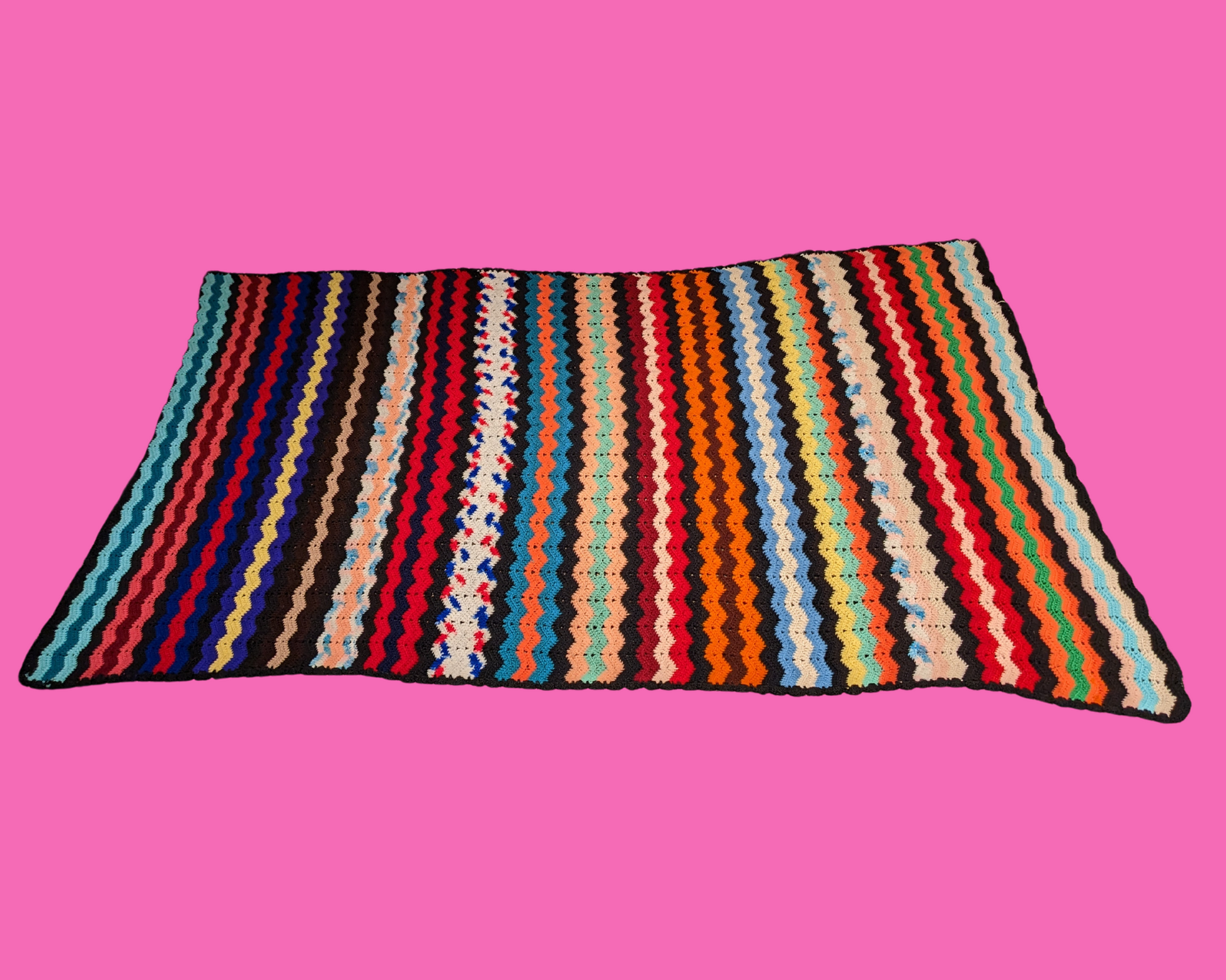 • Couverture en crochet acrylique vert, jaune et blanc vintage des années 1960