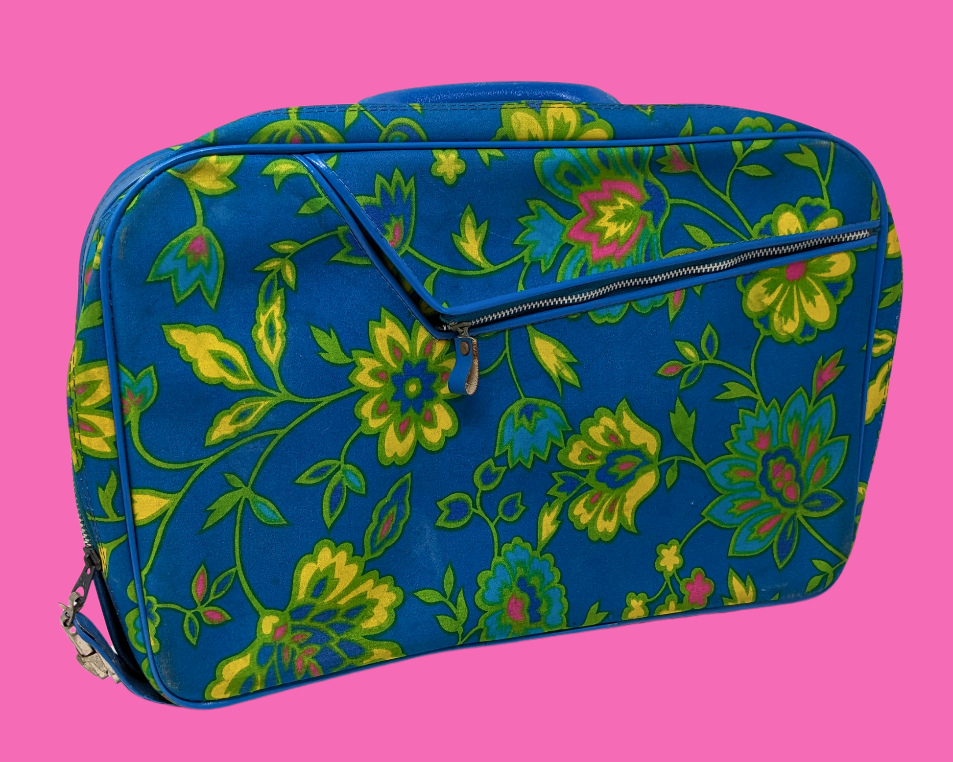 Valise vintage à motifs floraux verts, bleus et jaunes des années 1960, fabriquée au Japon