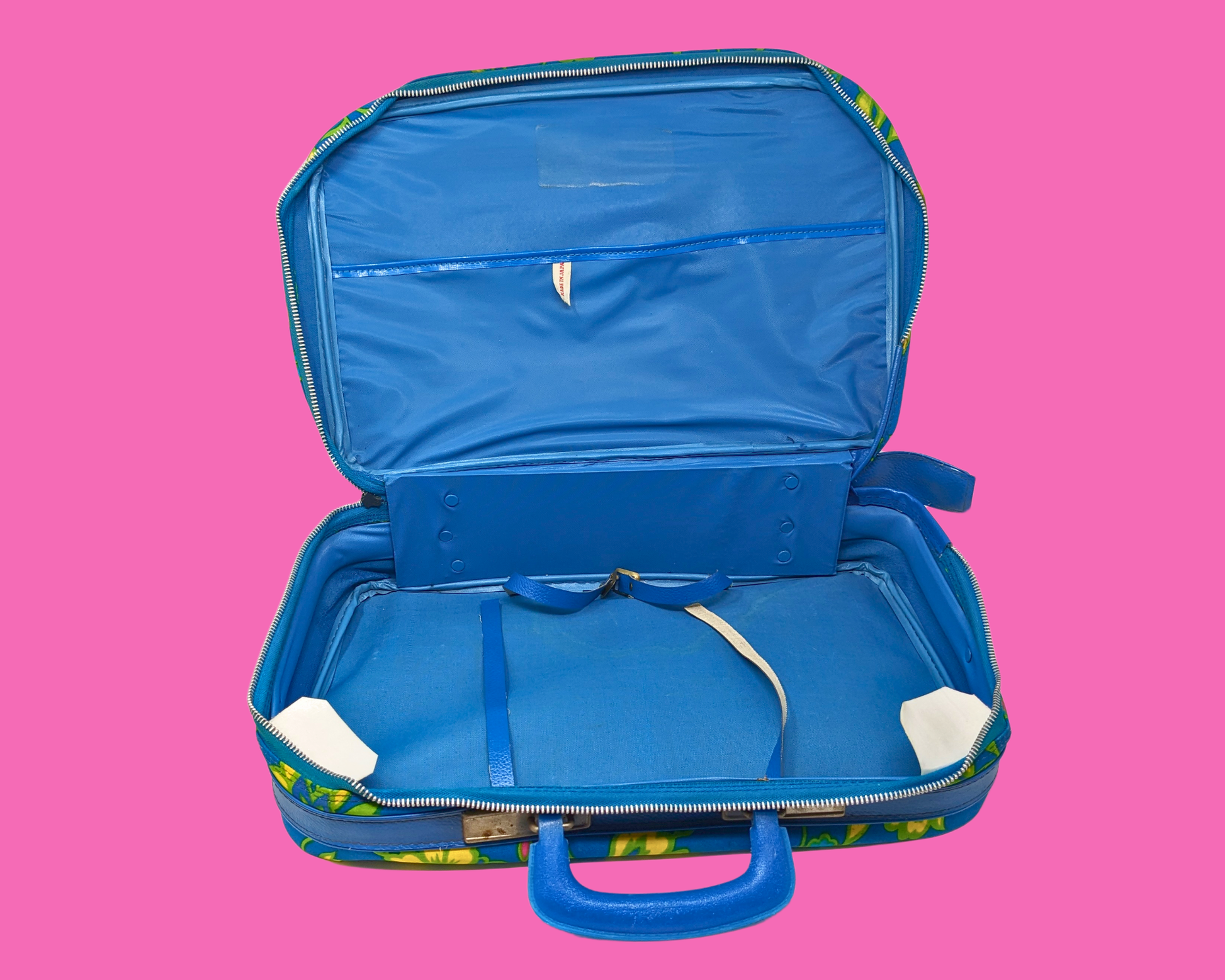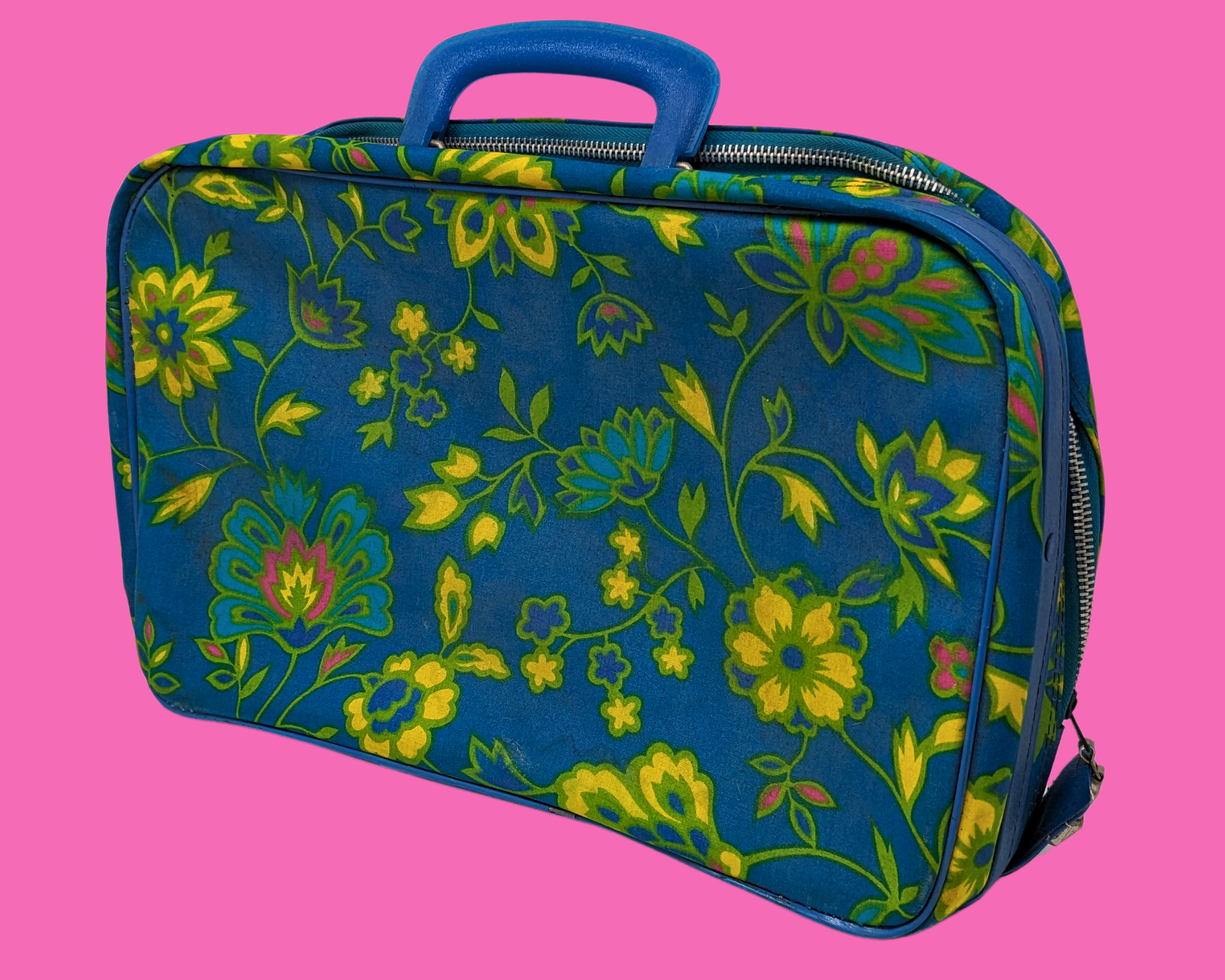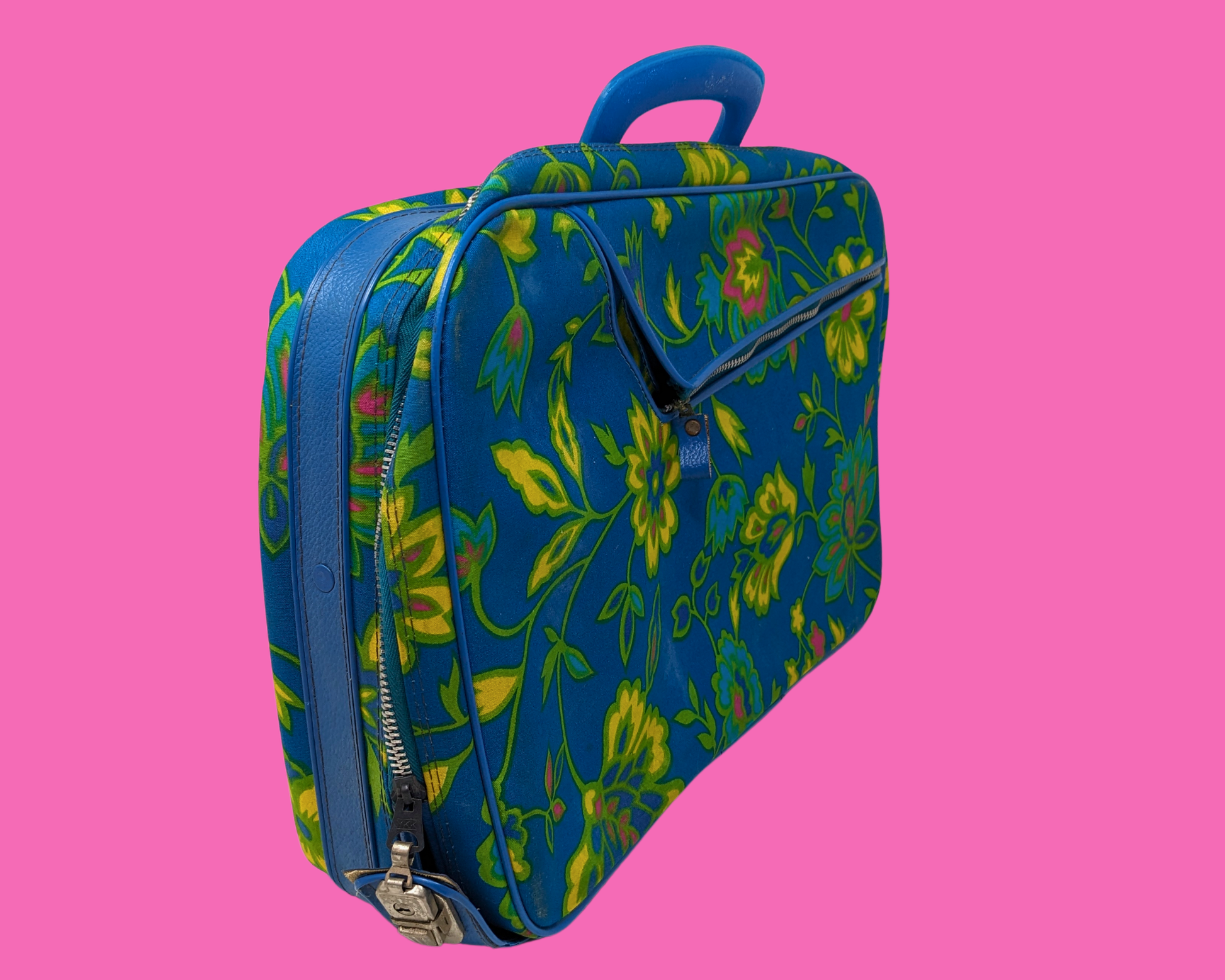 • Valise vintage à motif floral vert, bleu et jaune des années 1960, fabriquée au Japon