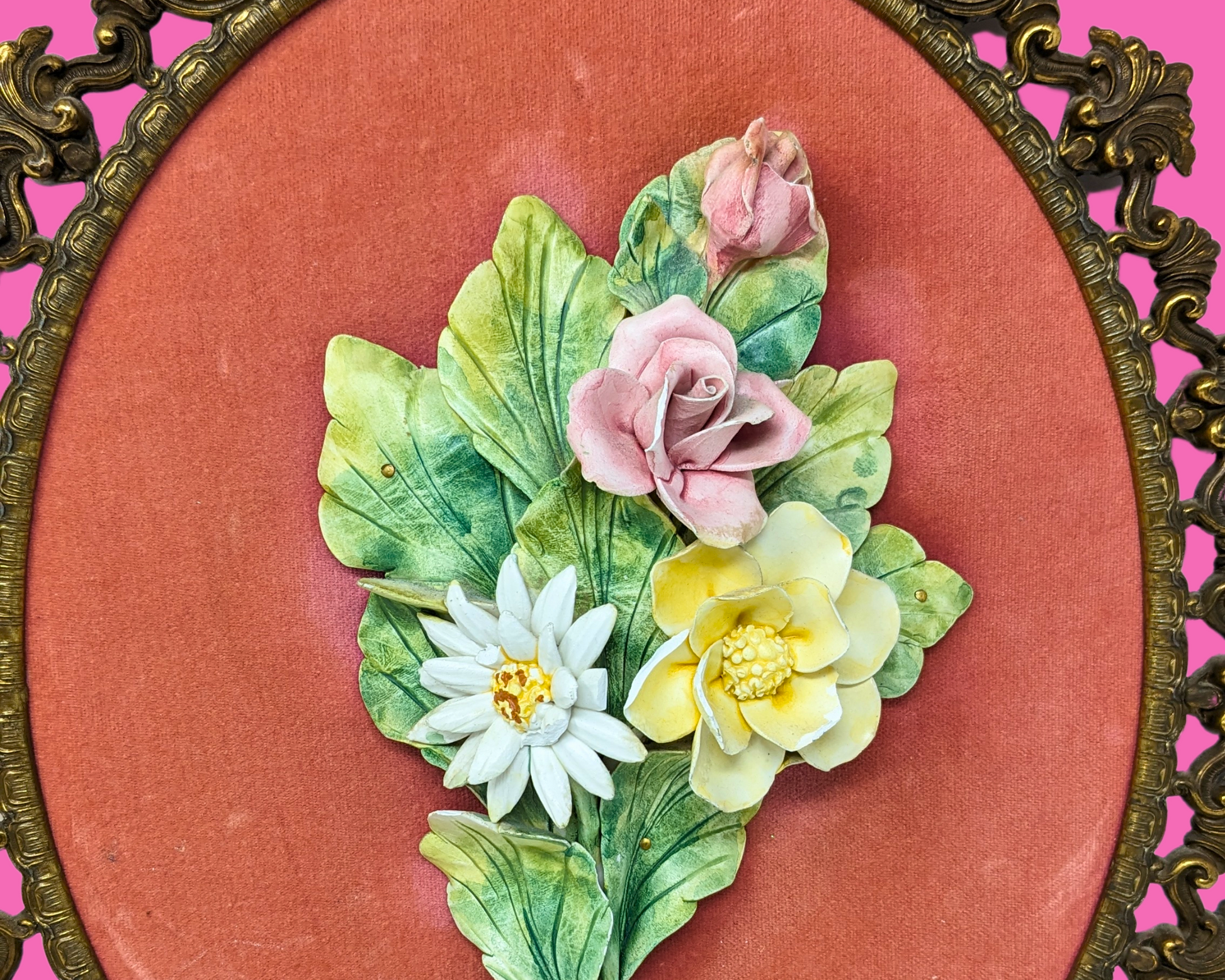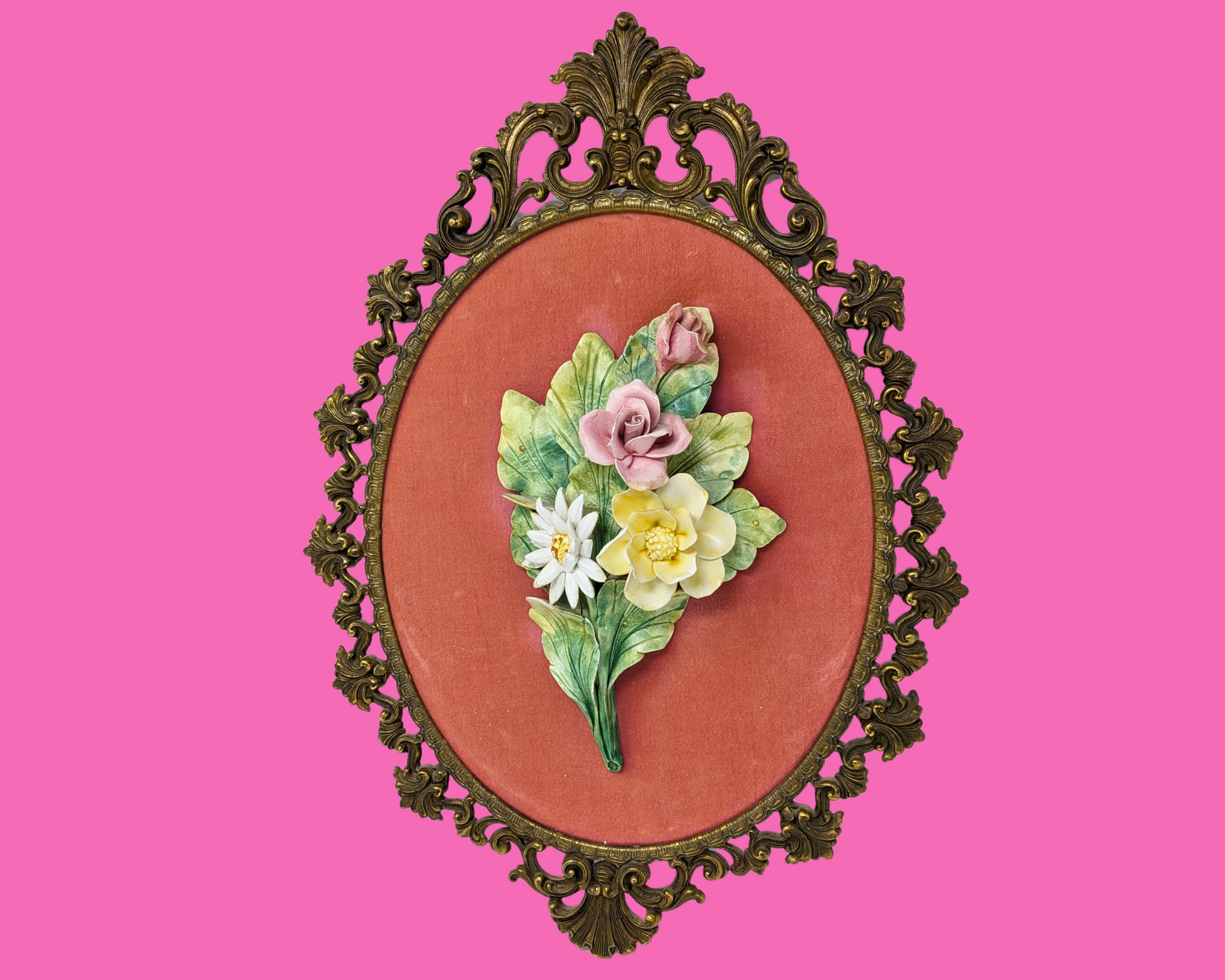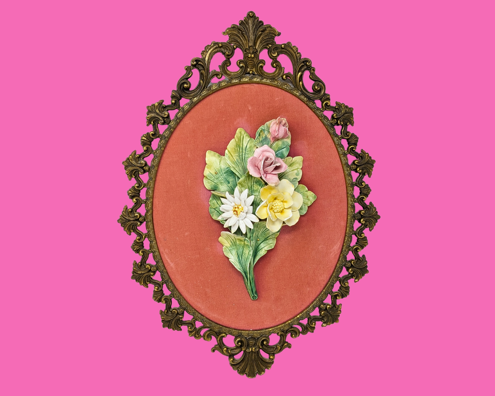 • Plateau ovale vintage en métal doré des années 1960 avec fleurs en céramique