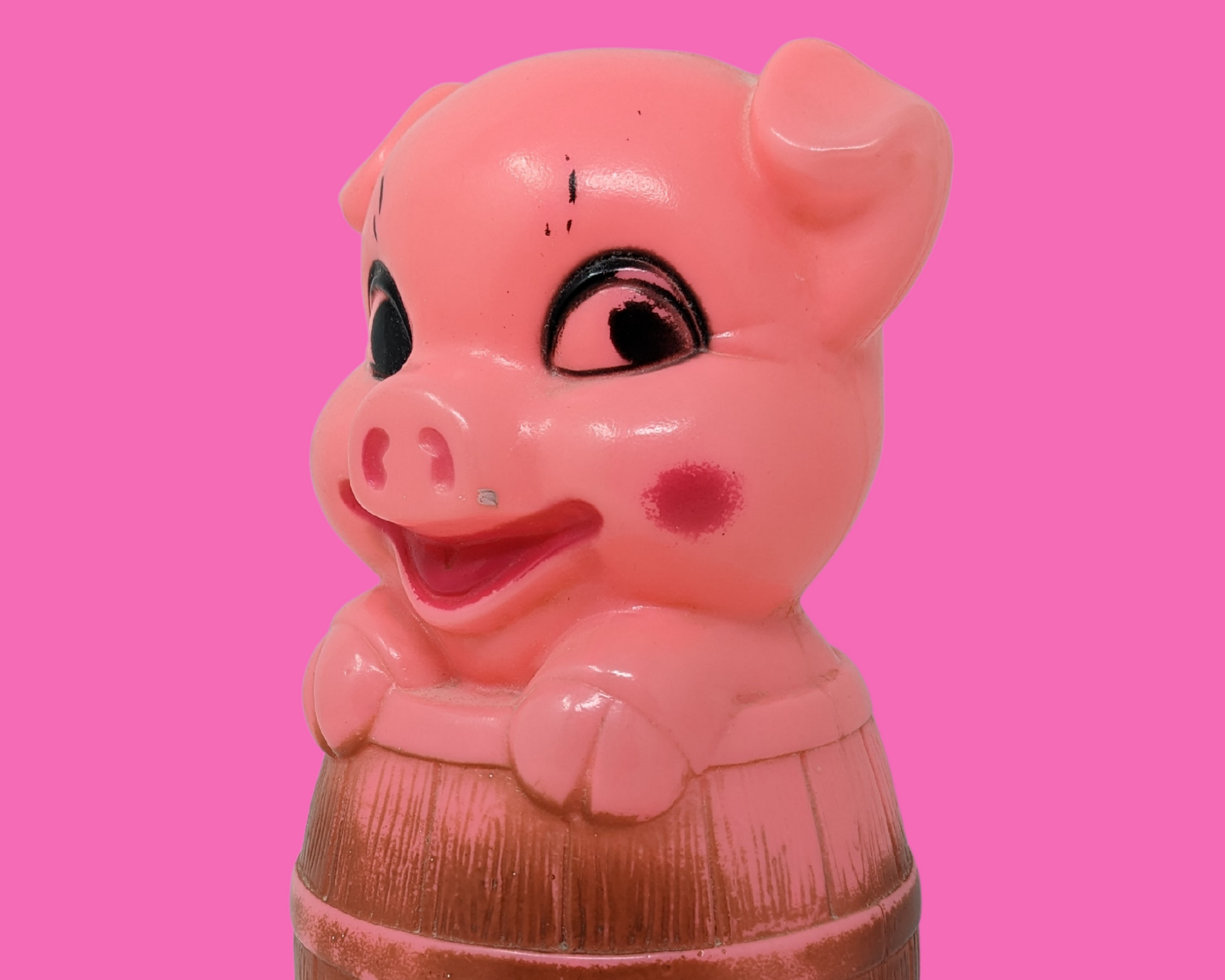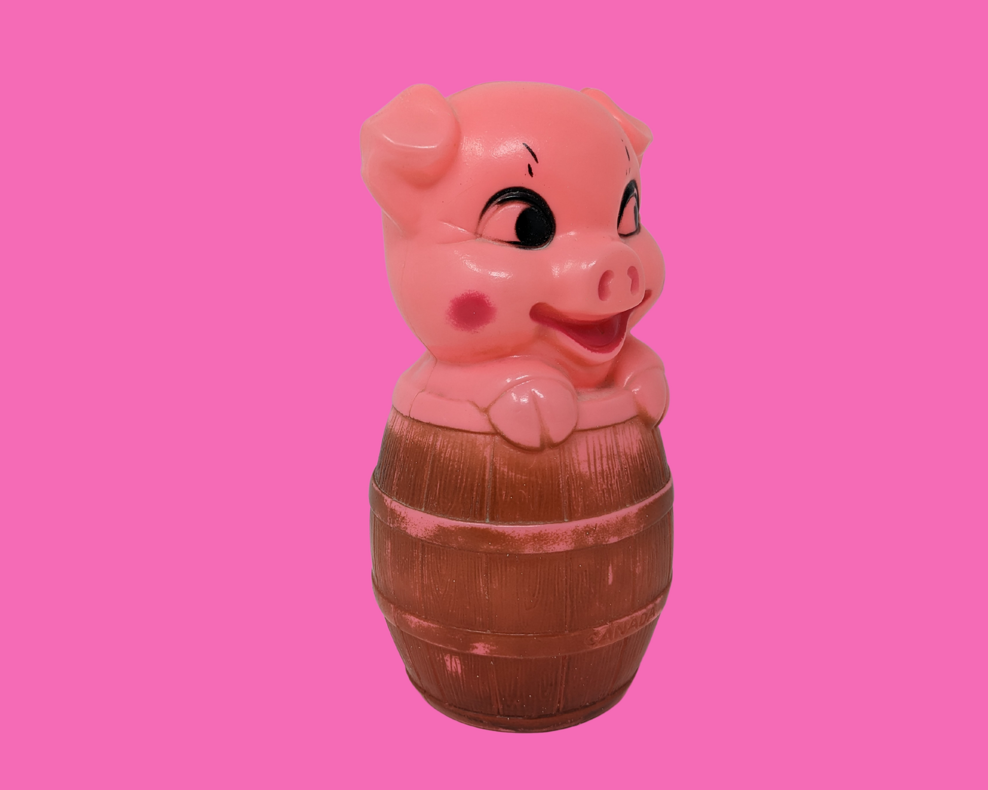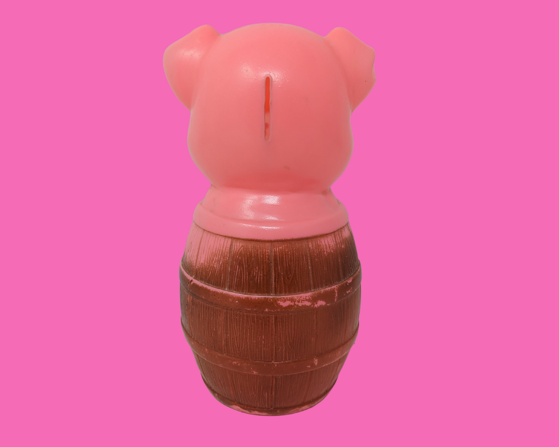 • Tirelire en plastique vintage des années 1960, cochon dans un tonneau