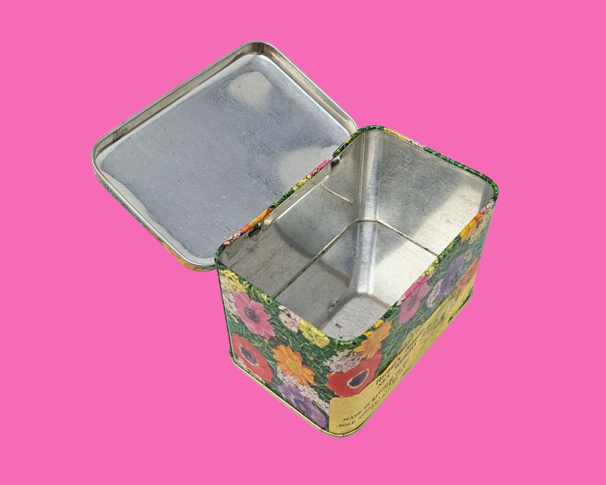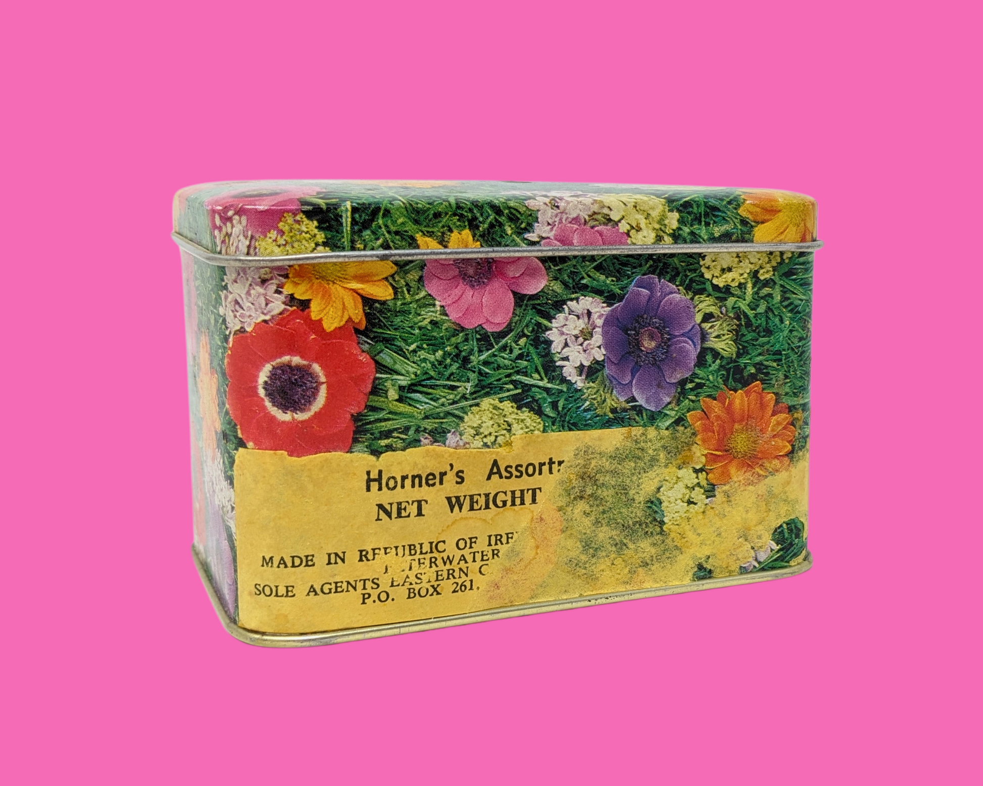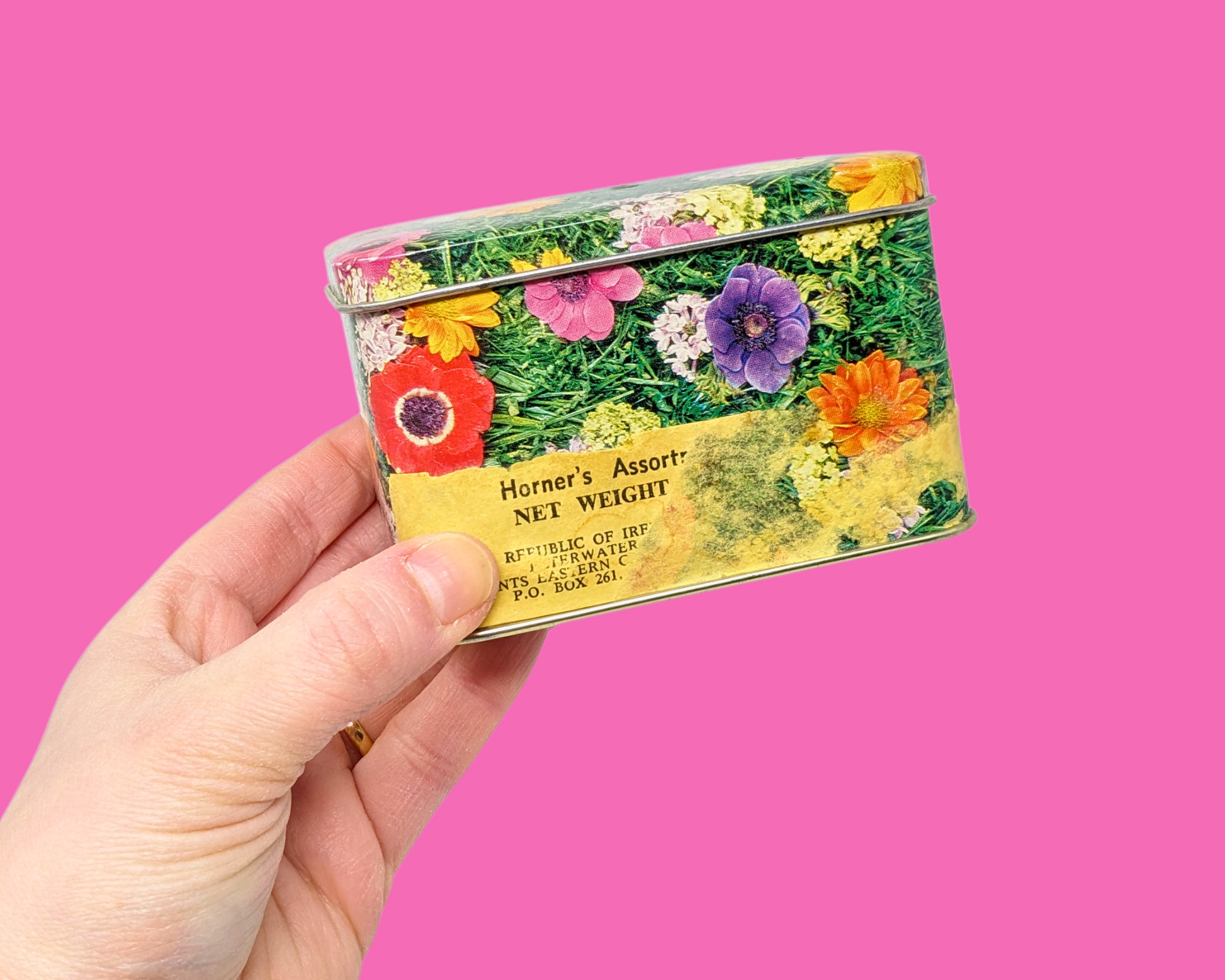• Petite boîte en fer blanc florale vintage des années 1960 fabriquée en Irlande
