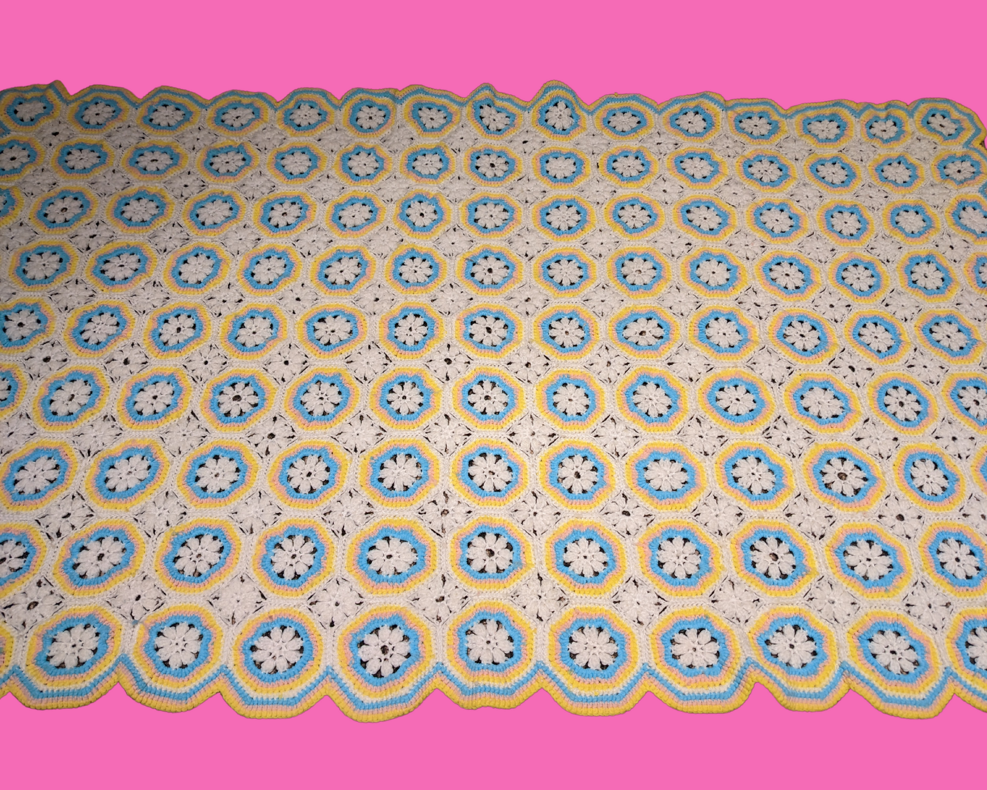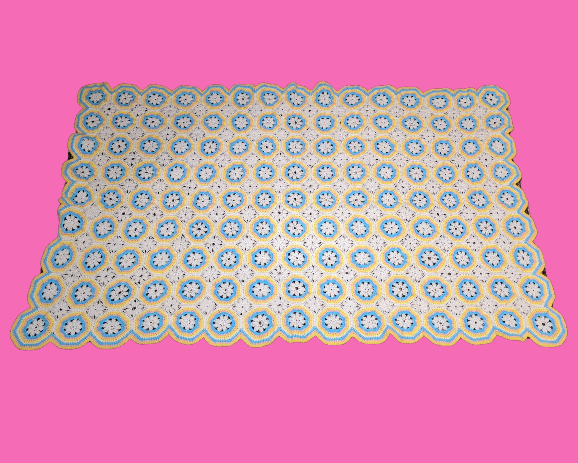 • Couverture en crochet acrylique vert, jaune et blanc vintage des années 1960