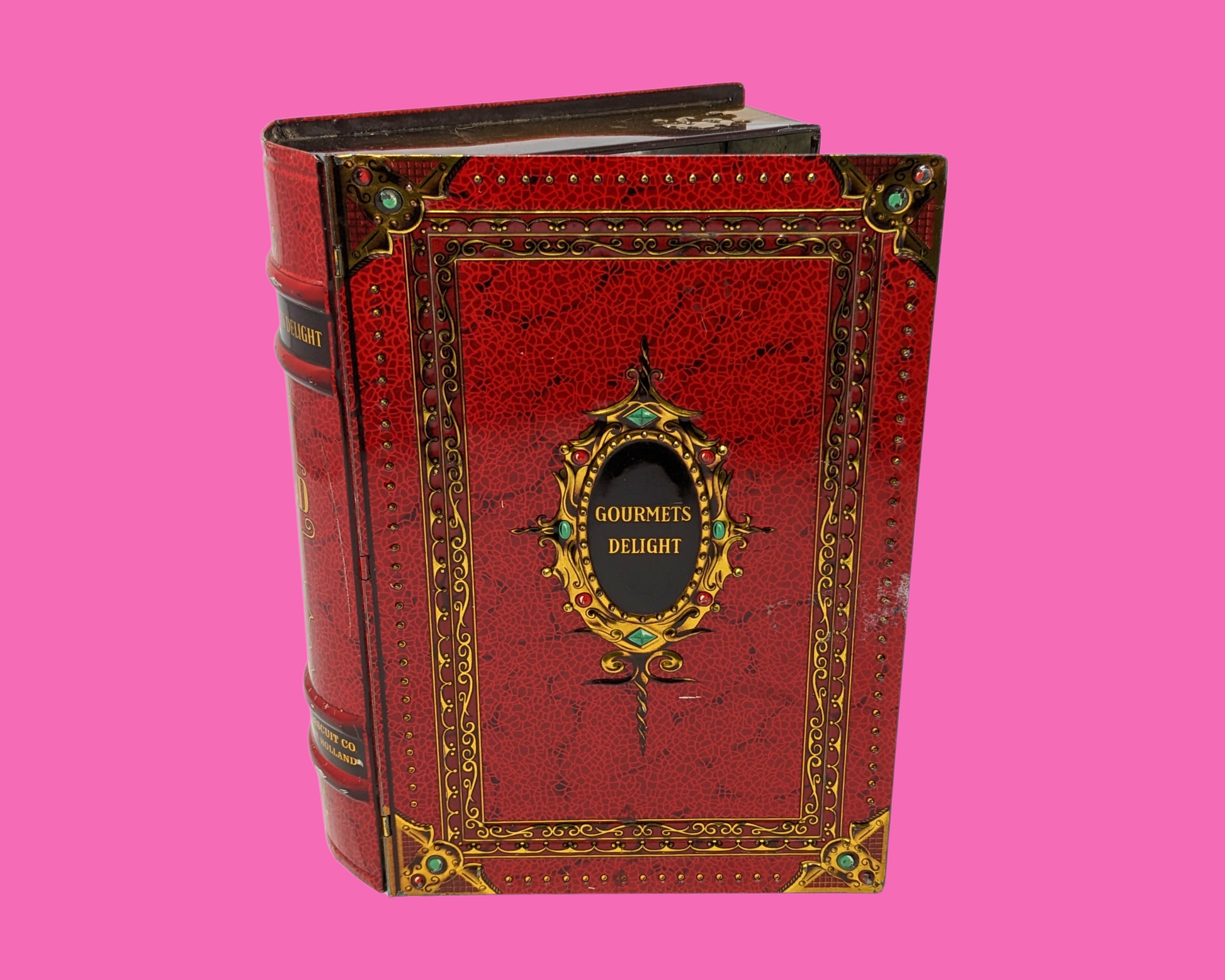 • Boîte en fer blanc rouge Gourmets Delight vintage des années 1970, en forme de livre