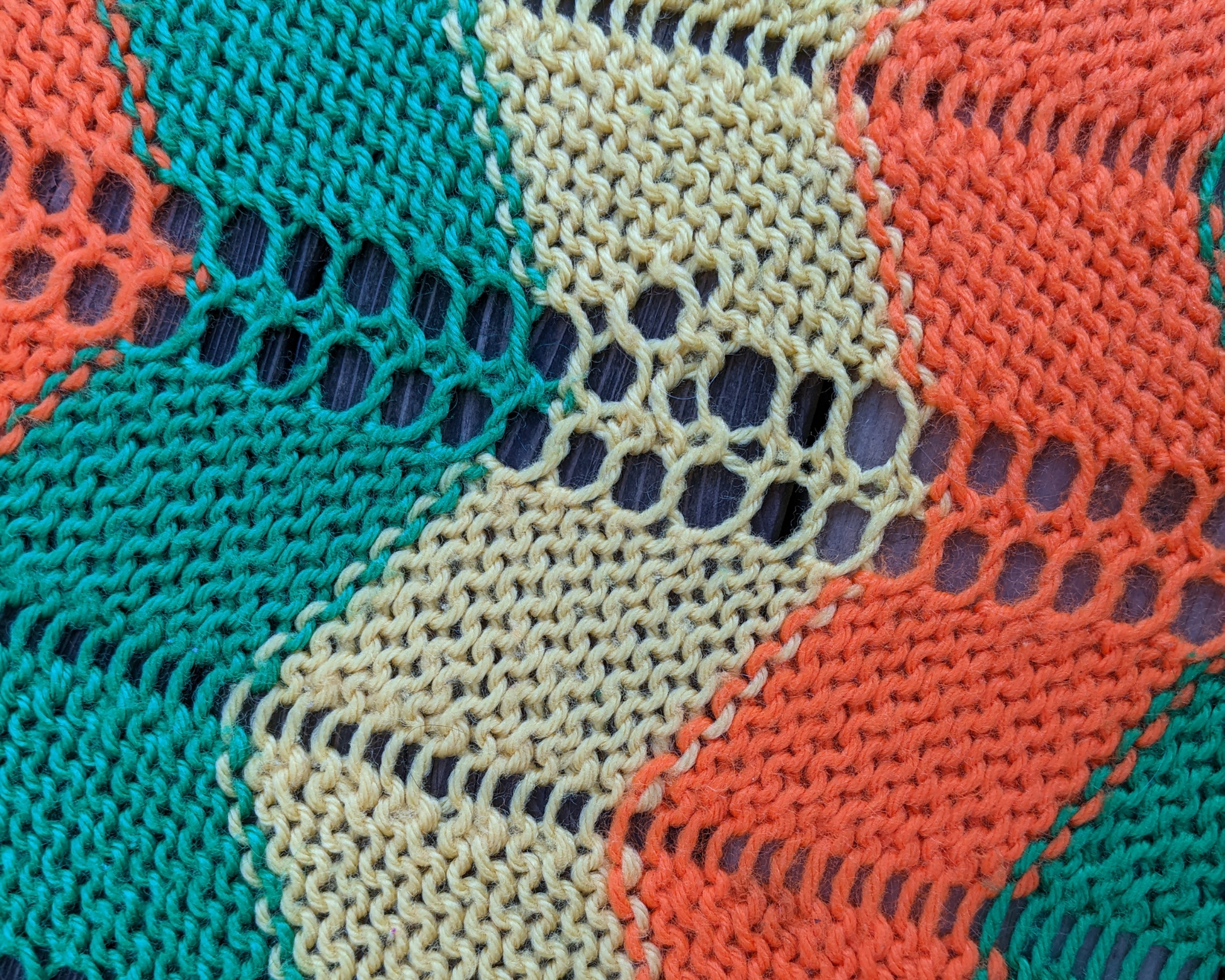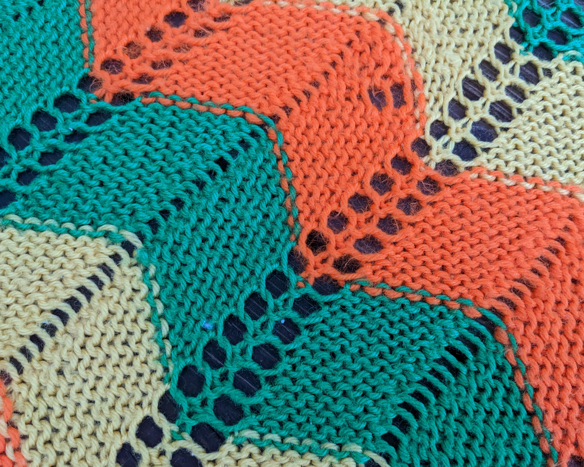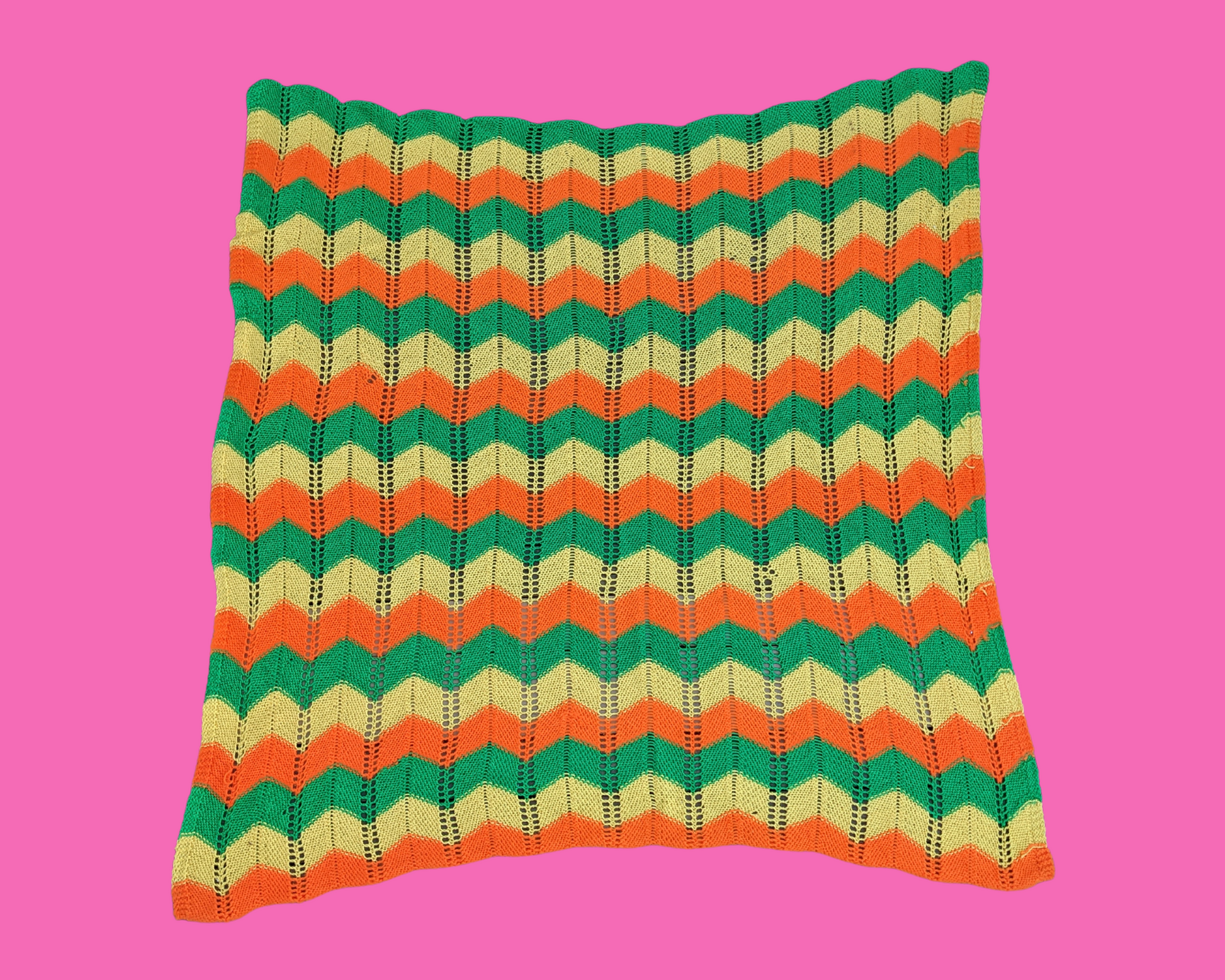 • Couverture au crochet en laine verte, orange et jaune vintage des années 1970