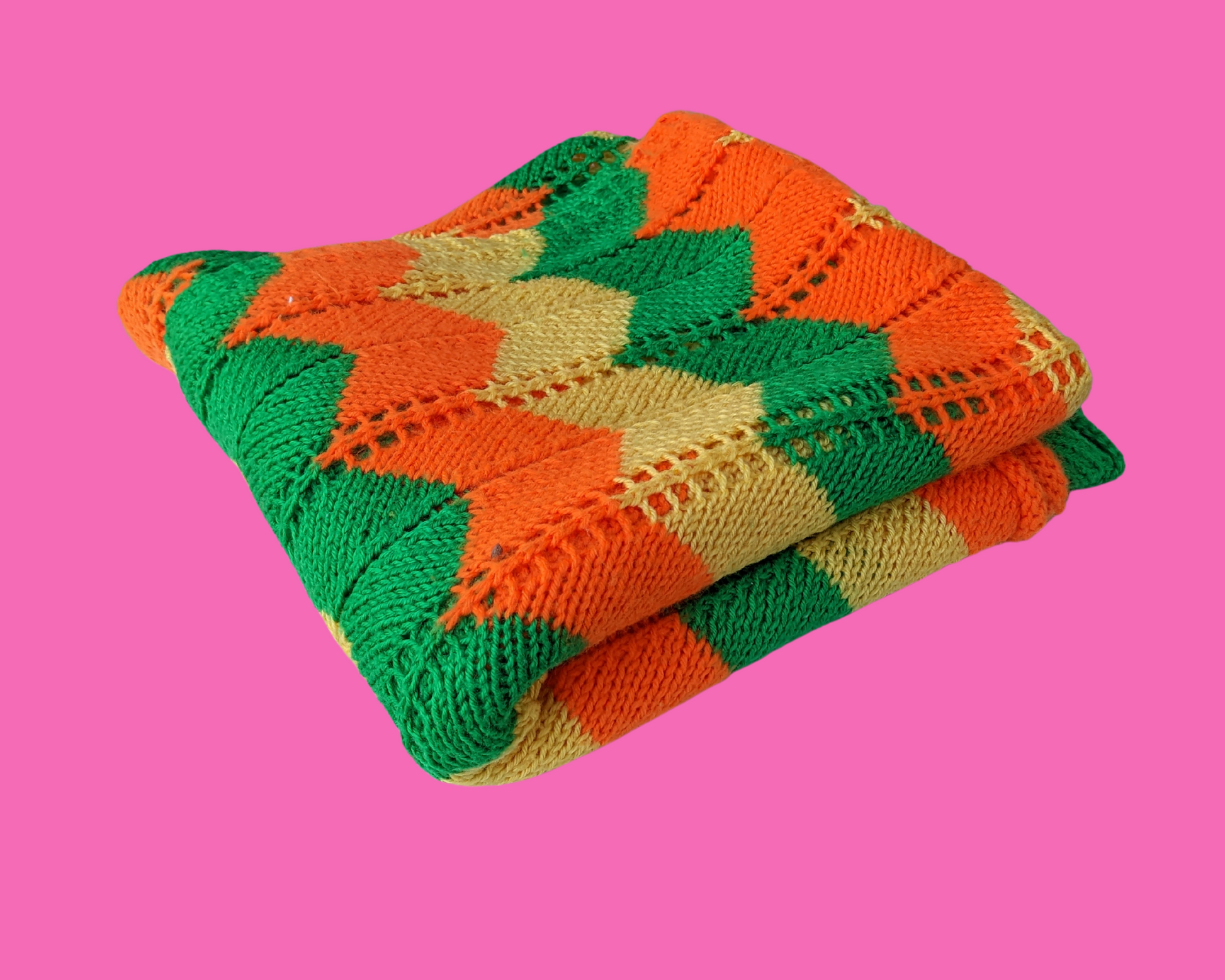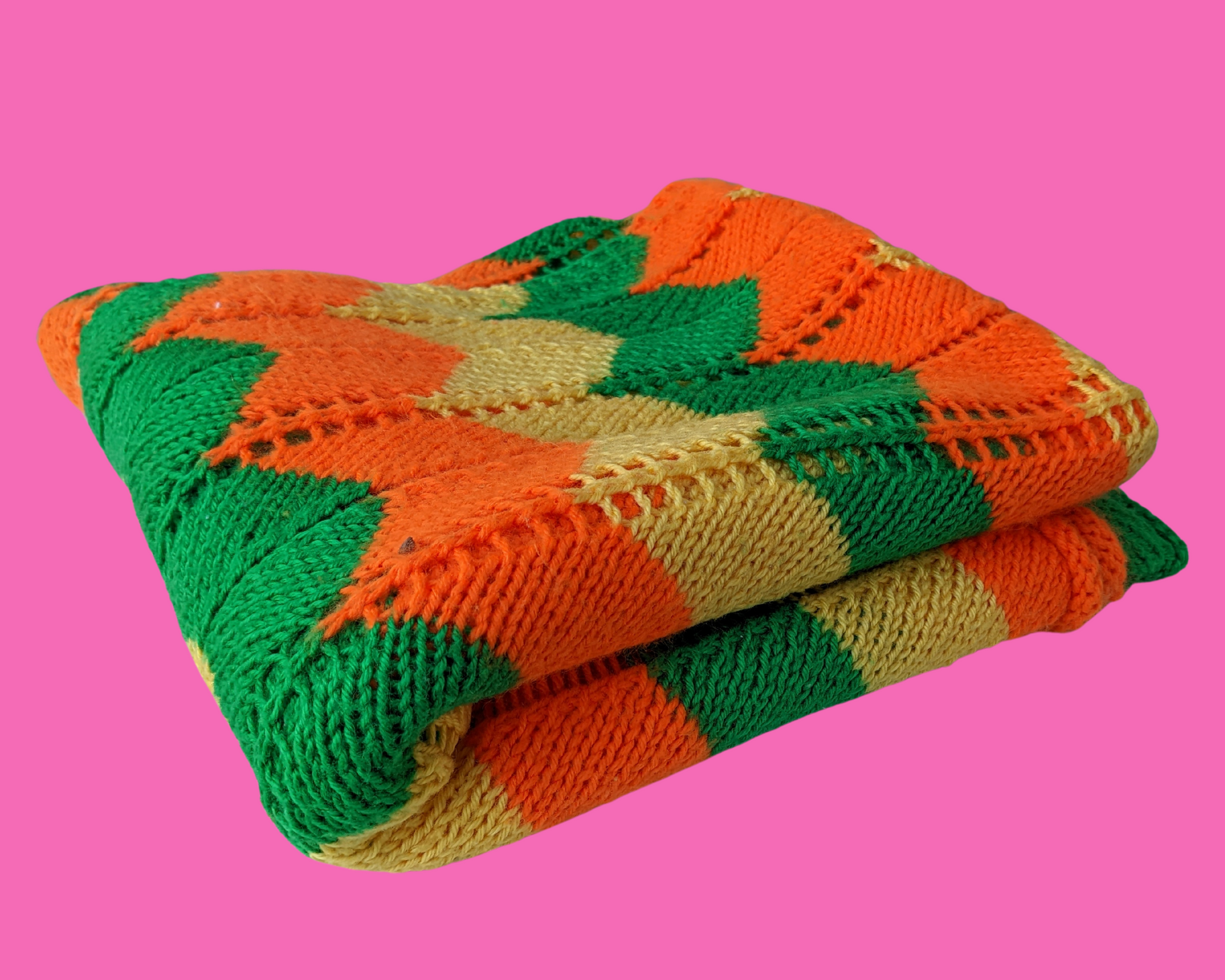 Couverture au crochet en laine verte, orange et jaune vintage des années 1970