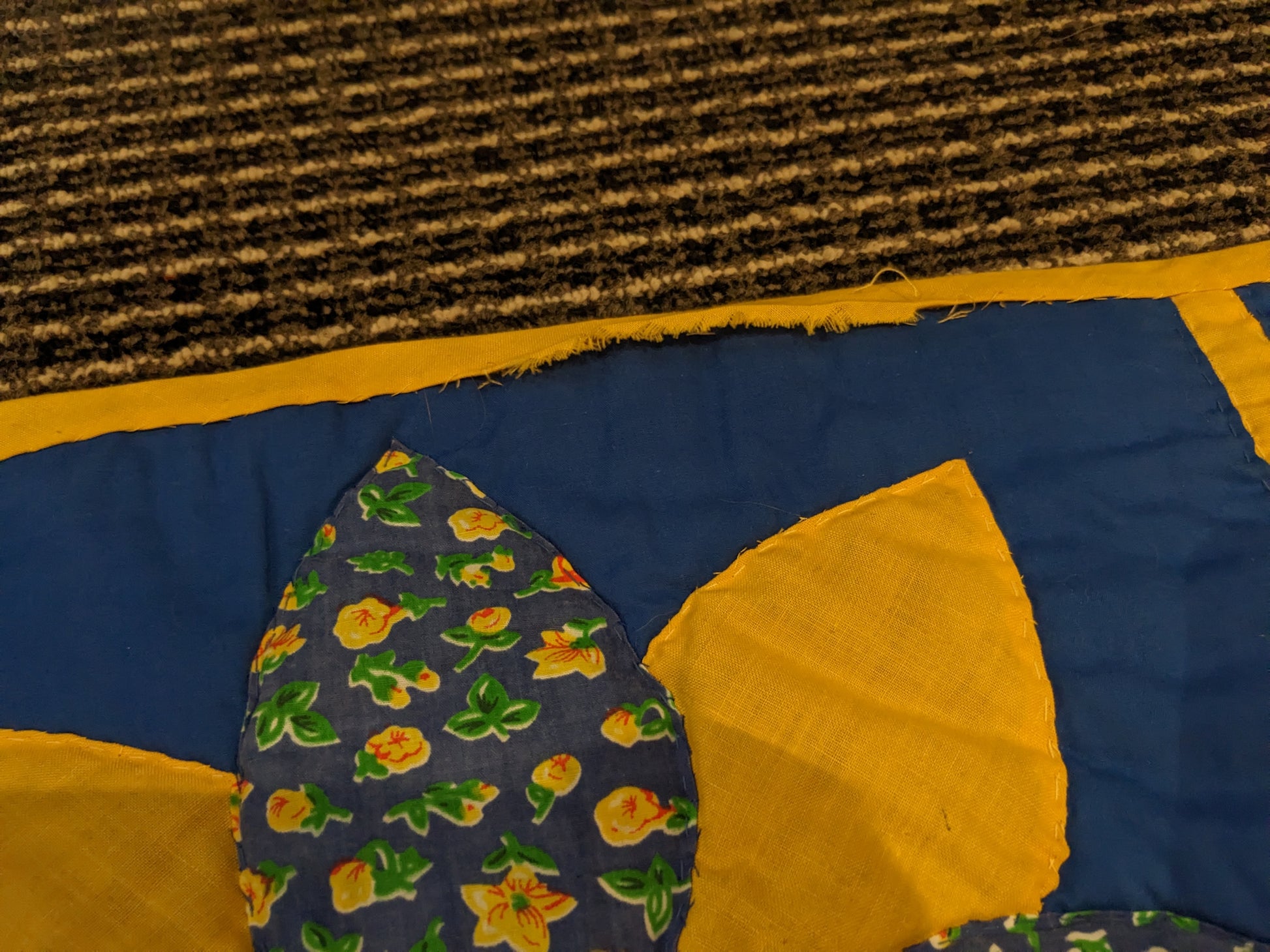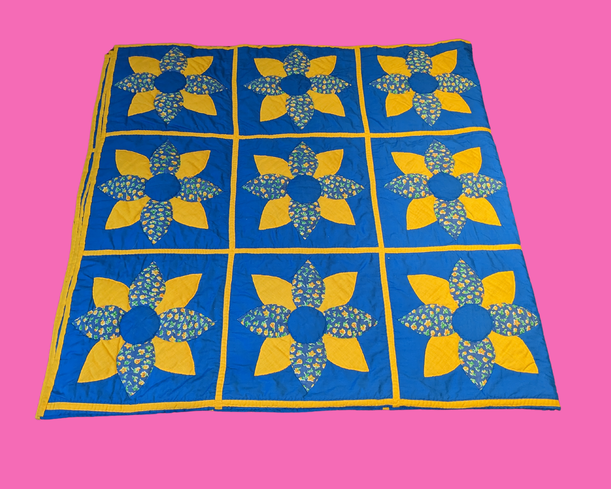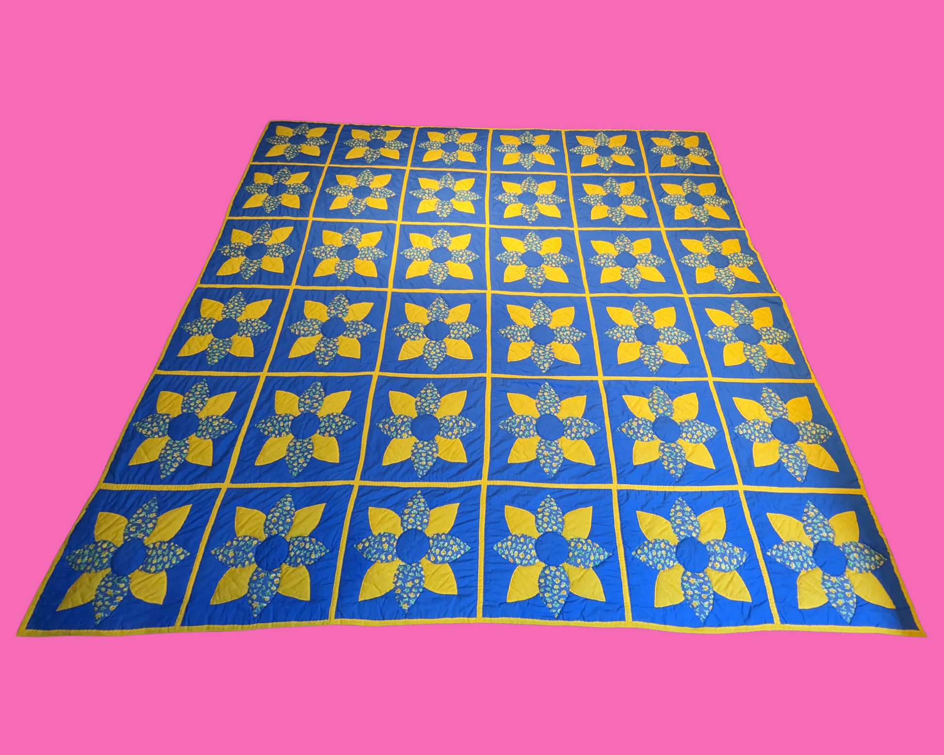 • Énorme couverture de couette bleue et jaune vintage des années 1970