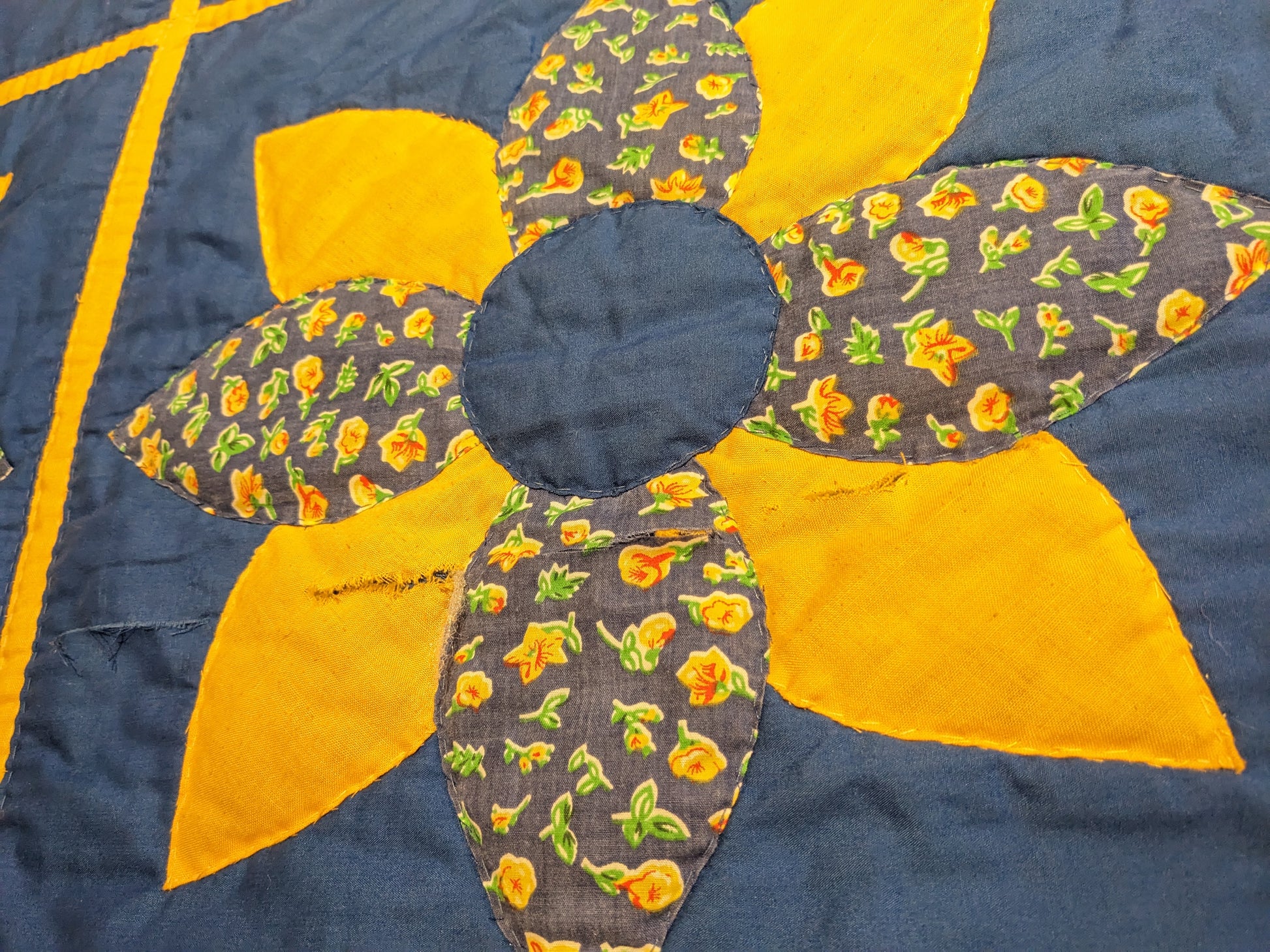 Grande couverture de couette bleue et jaune vintage des années 1970