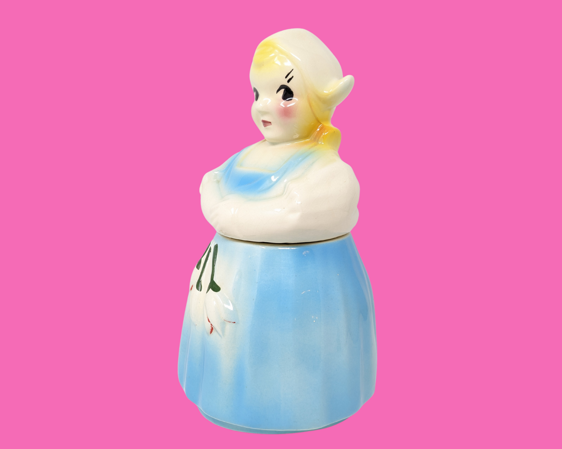 • Petite fille danoise vintage des années 1970 dans une jarre à biscuits en robe bleue