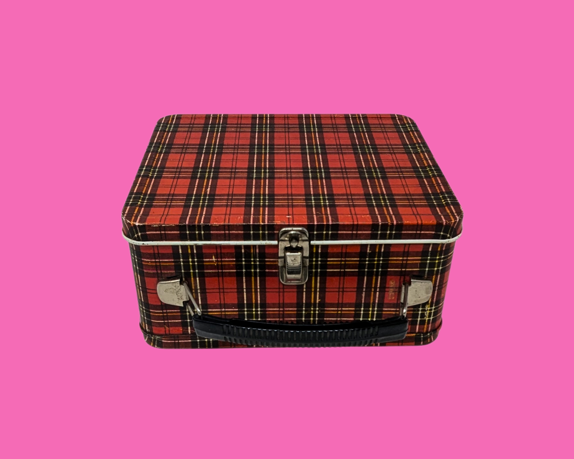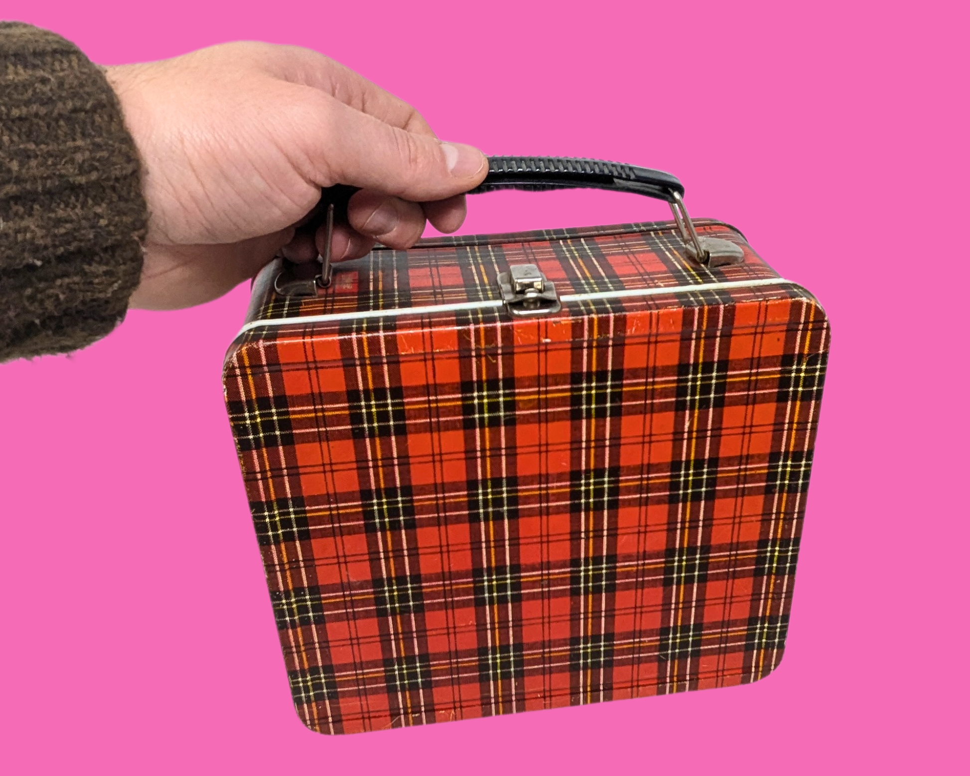 Boîte en fer blanc vintage à carreaux rouges des années 1970 par Aladdin Industries à Nashville, Tennessee