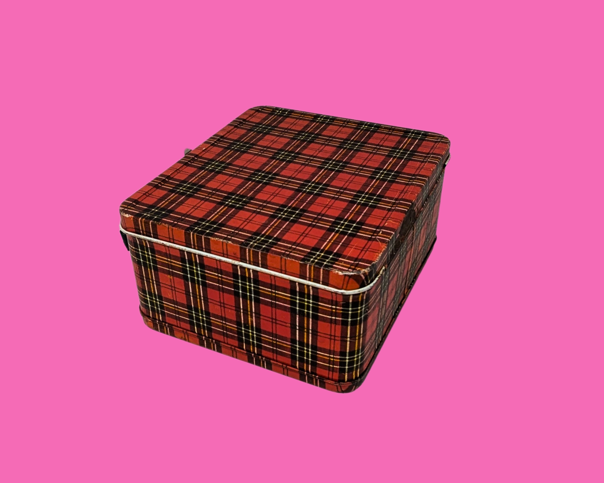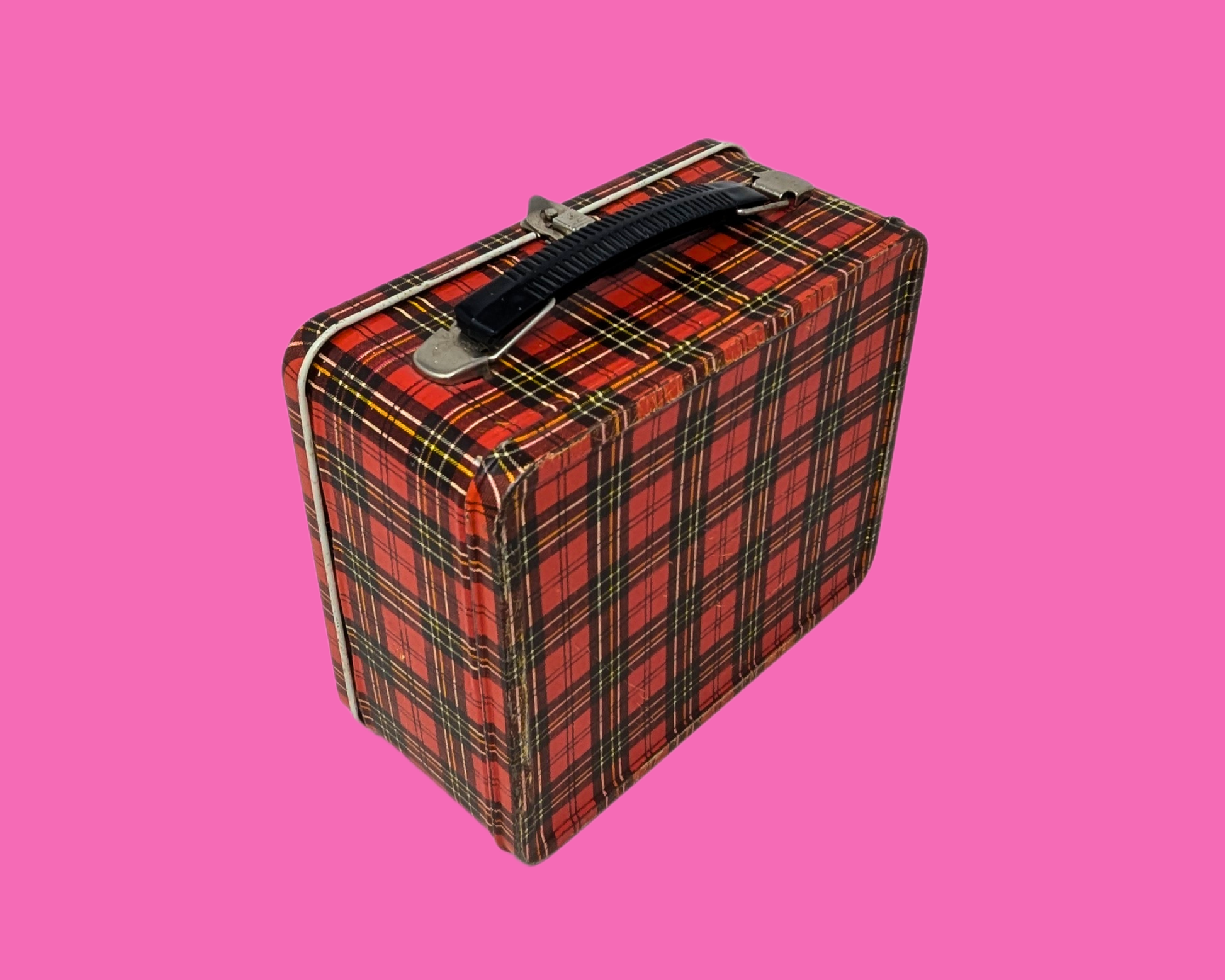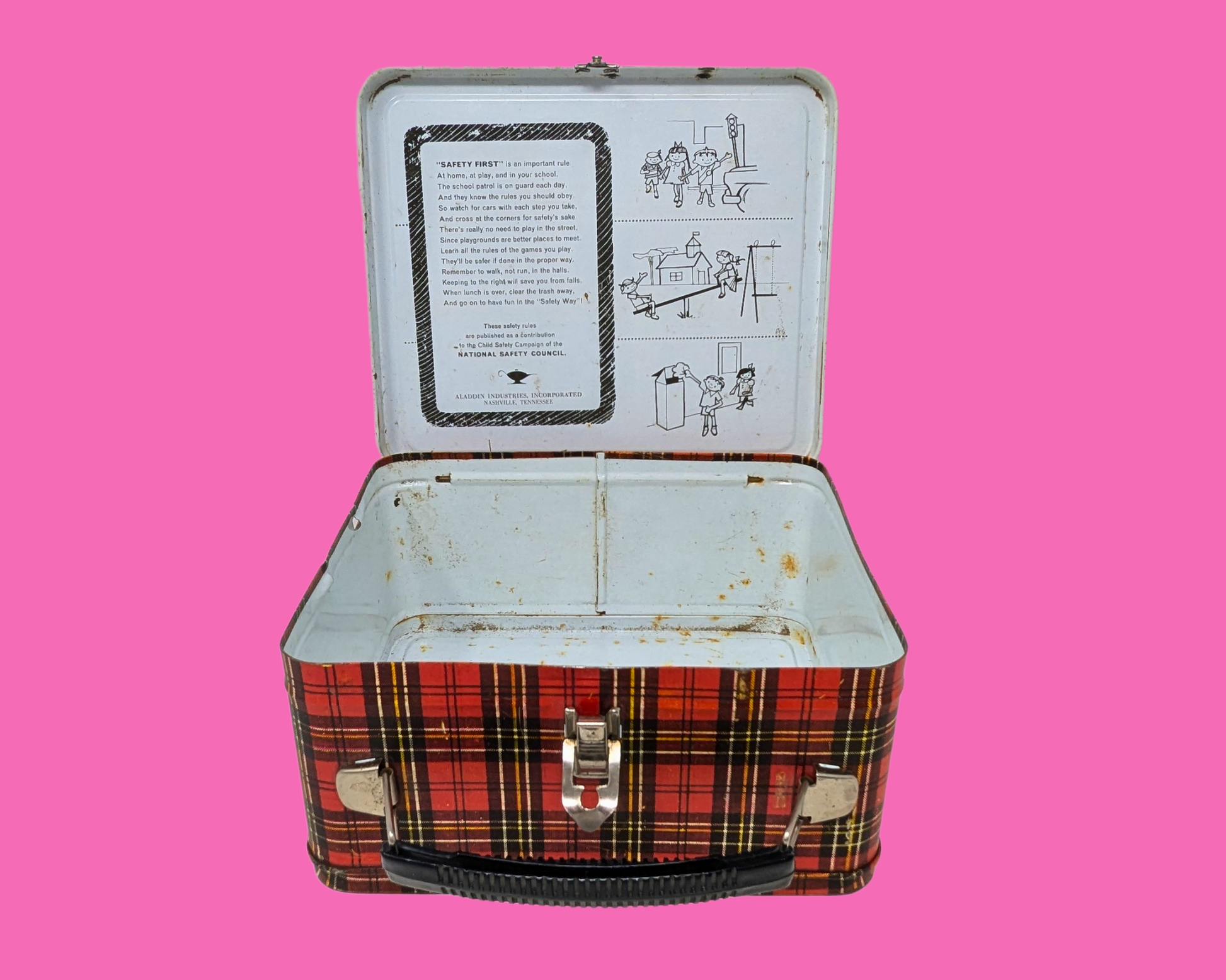 • Boîte en fer blanc à carreaux rouges vintage des années 1970 par Aladdin Industries à Nashville, Tennessee