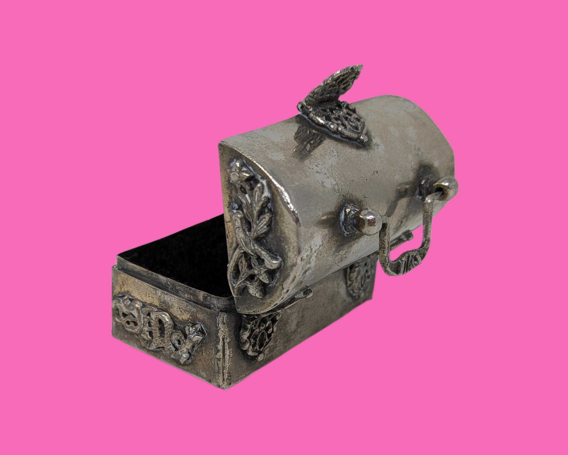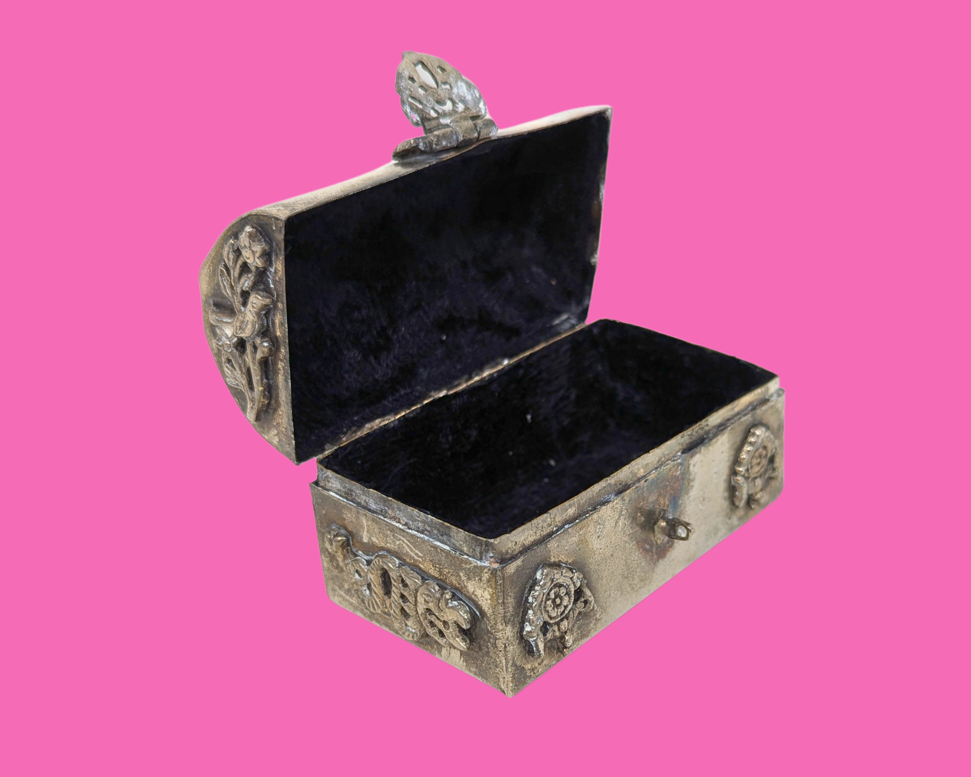 Petit coffre en métal vintage des années 1970, avec intérieur en velours