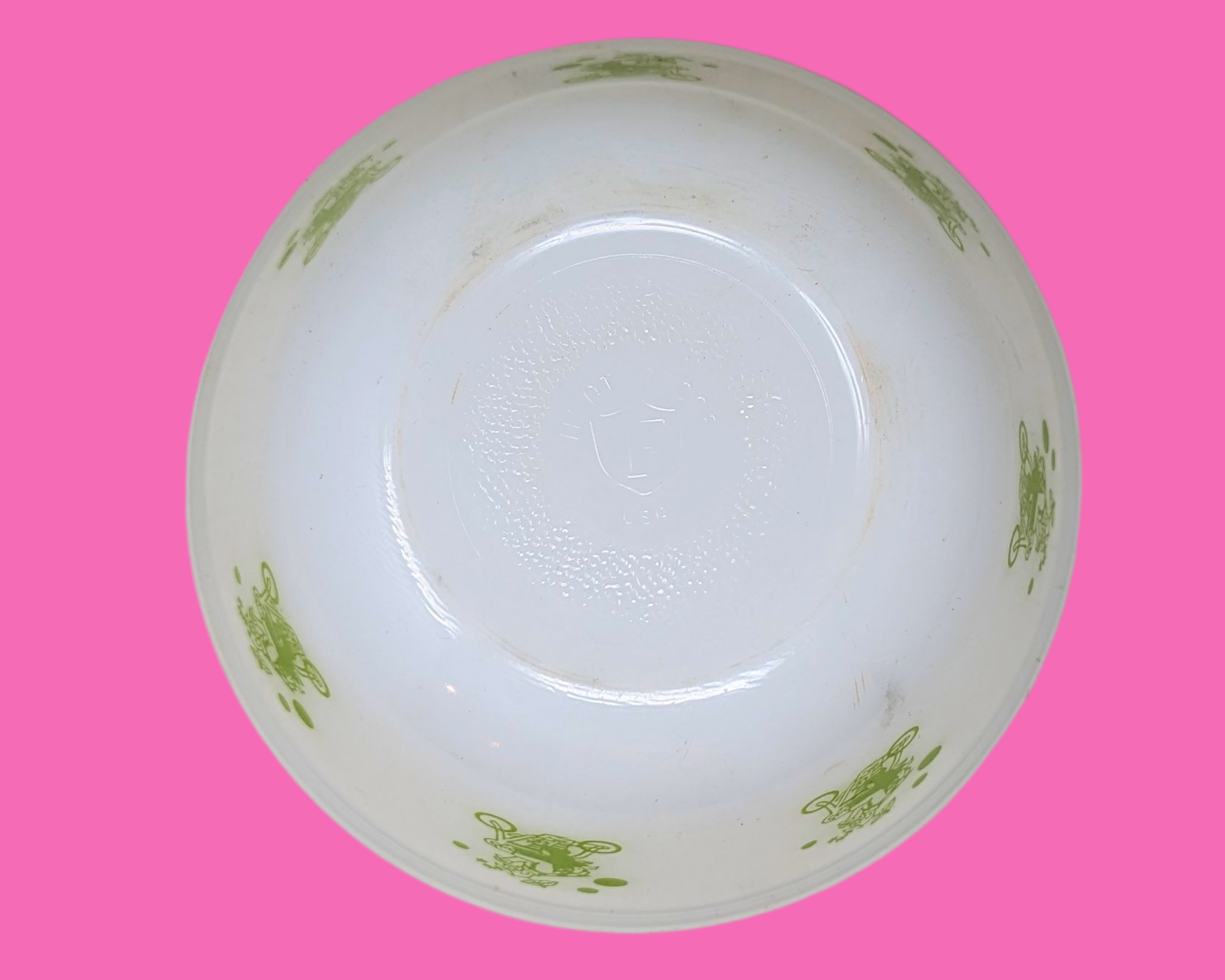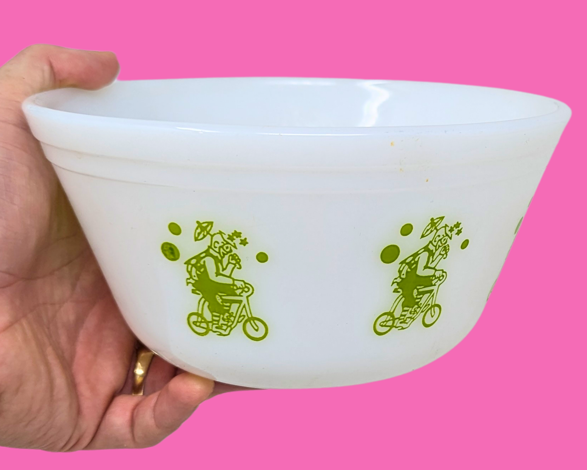 • Bol blanc et vert vintage des années 1970, illustrations de clowns à vélo