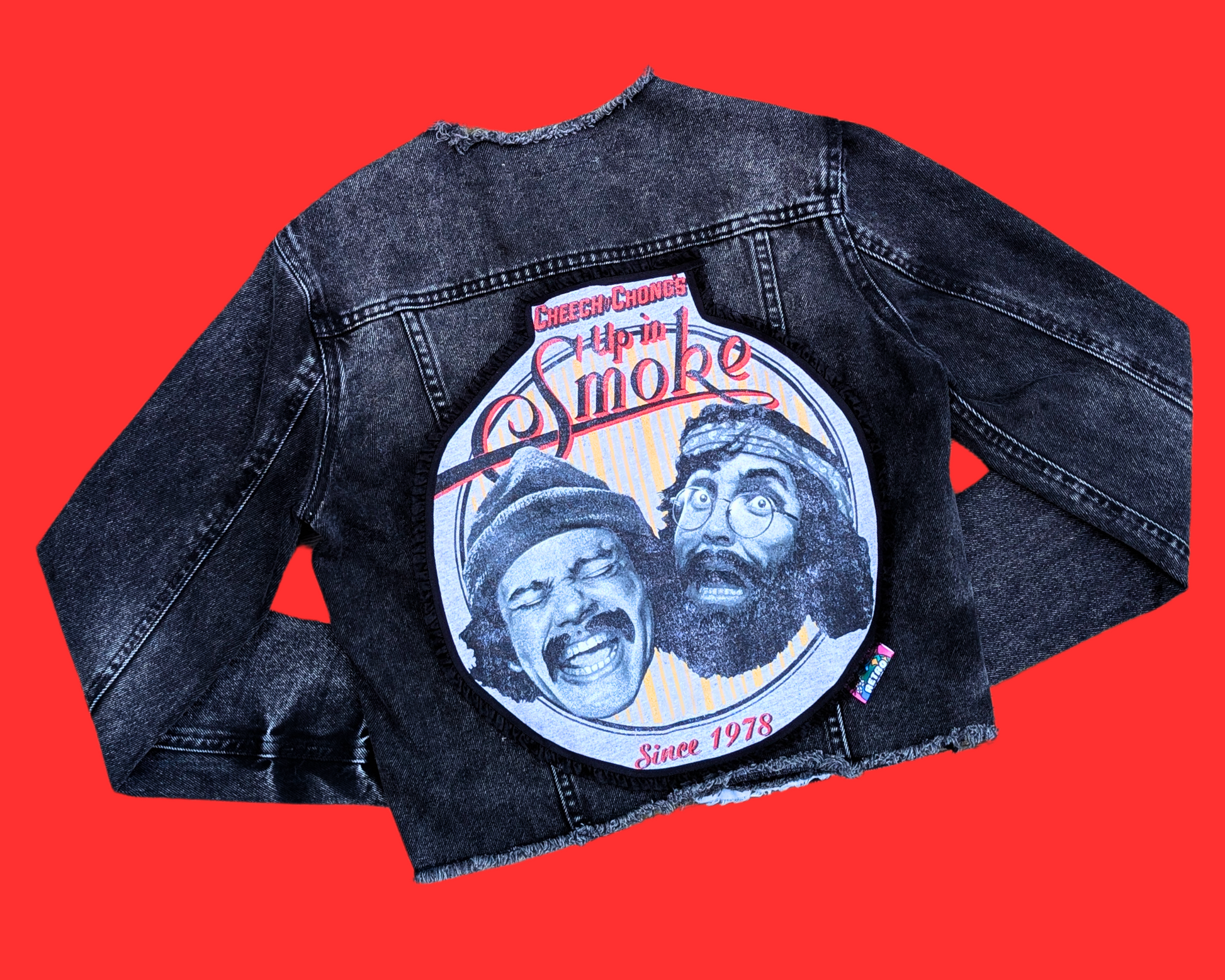 • Handmade, Upcycled Cheechy Chong's Up in Smoke Since 1978 Black Denim Jacket Size S
