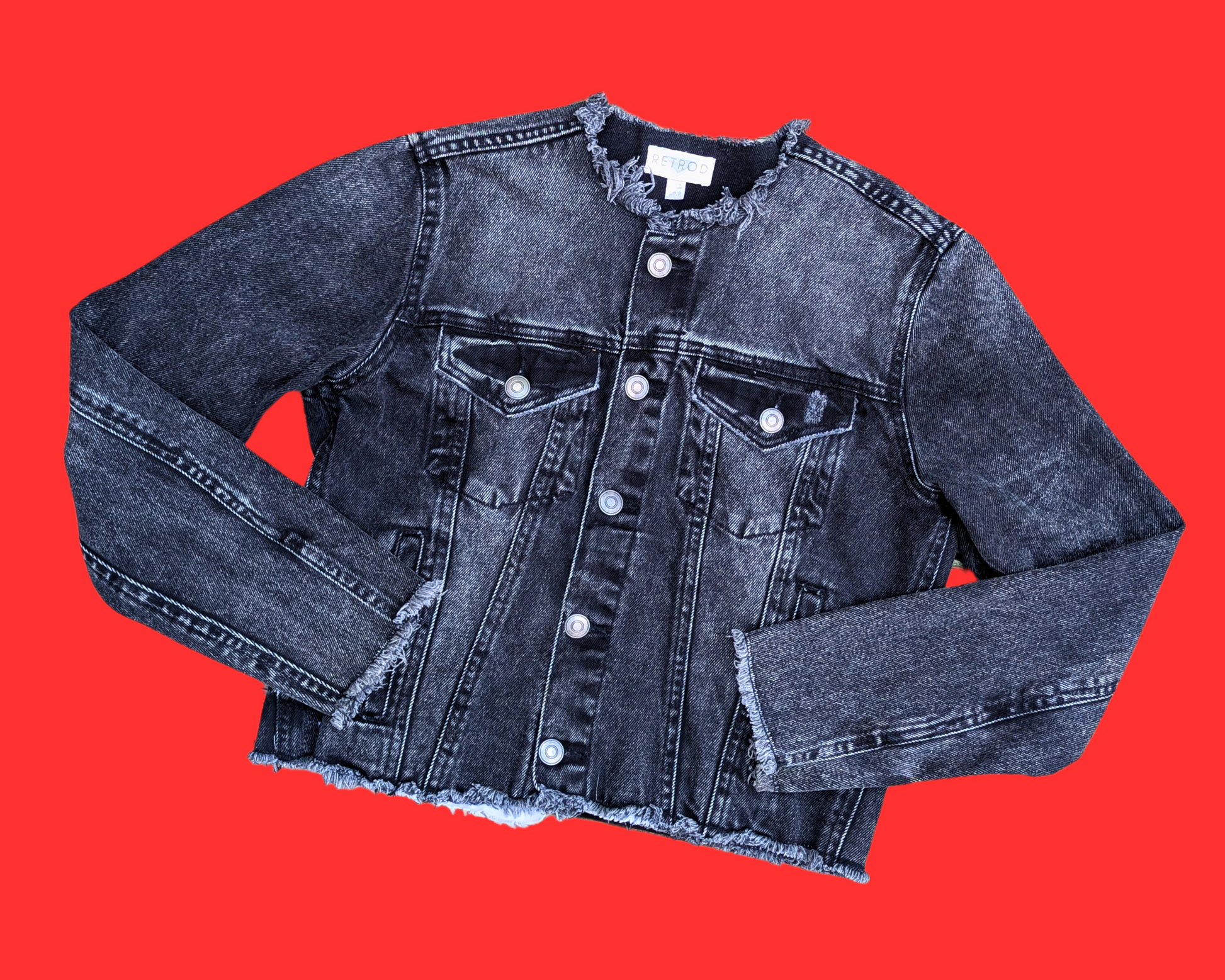In great upcycled condition. This jacket has a black lace around the graphic. It's also cropped.
