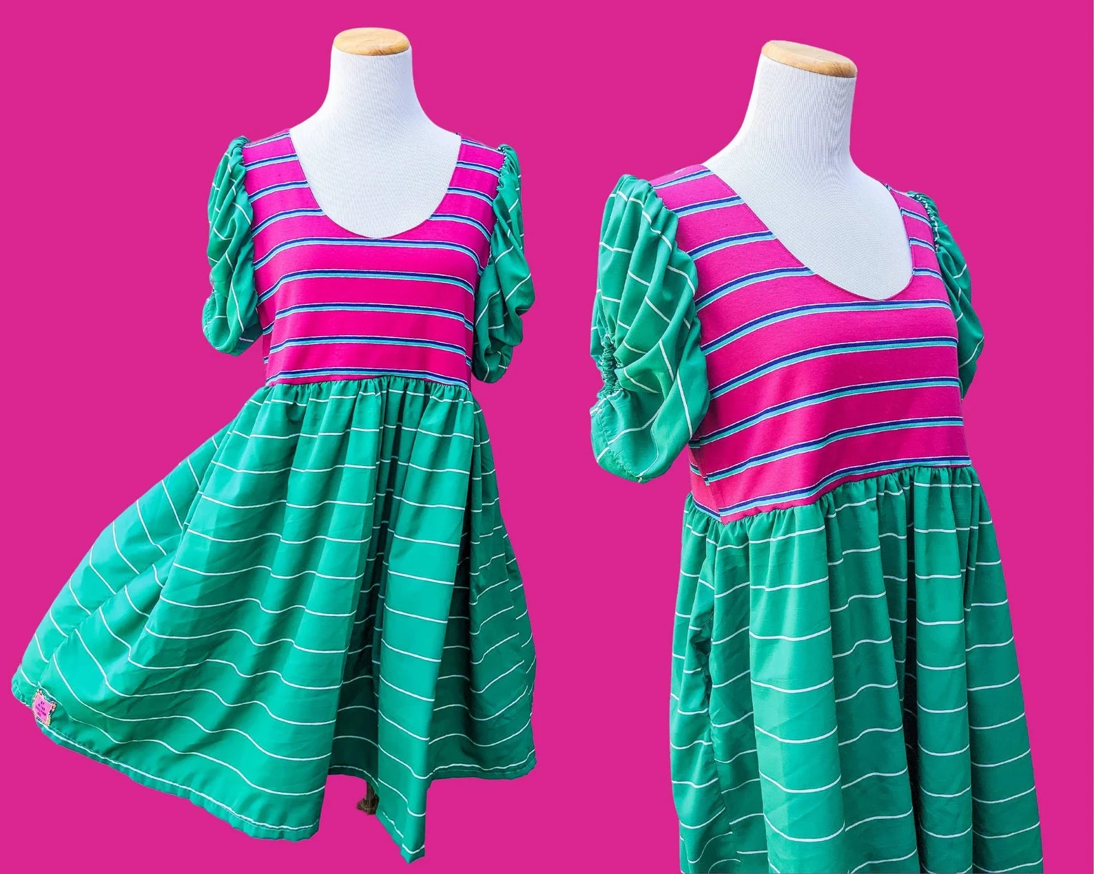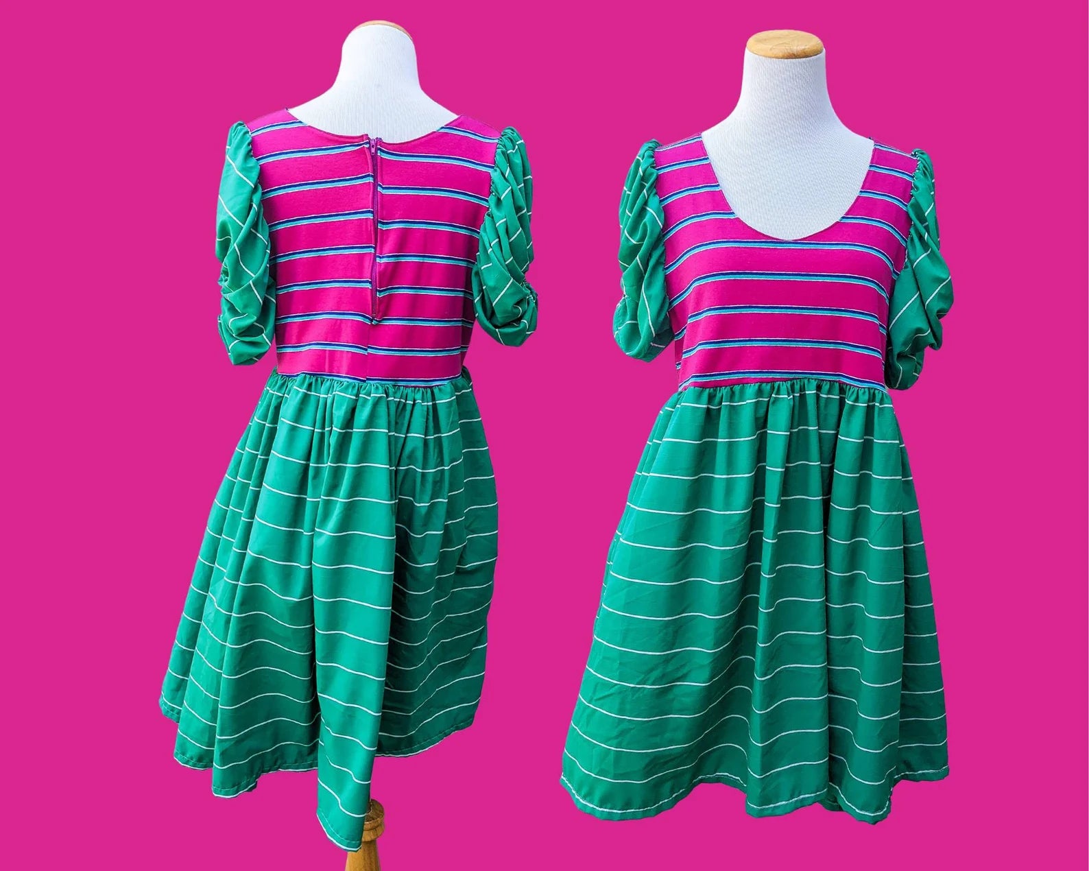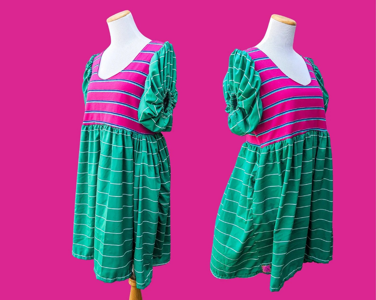 Handmade, Upcycled Pink Stretchable Striped Fabric and Silky Green and White Lined Fabric Dress, Short Puffy Sleeves Size S-M