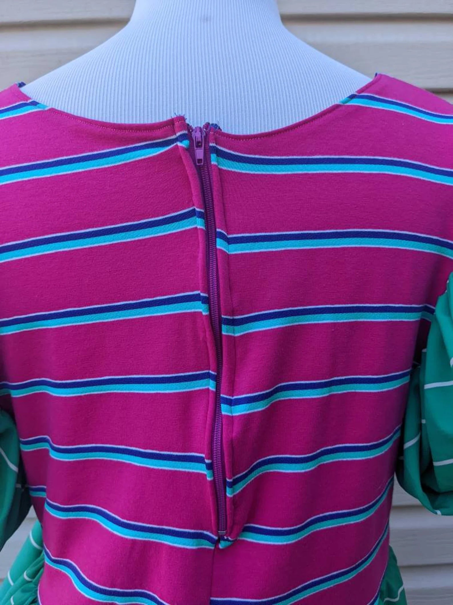• Handmade, upcycled Ruby Tuesday model, vintage 1990's warm, bright pink lined stretchable fabric for the bodice and a nice green and white striped silky fabric for the skirt and sleeves.