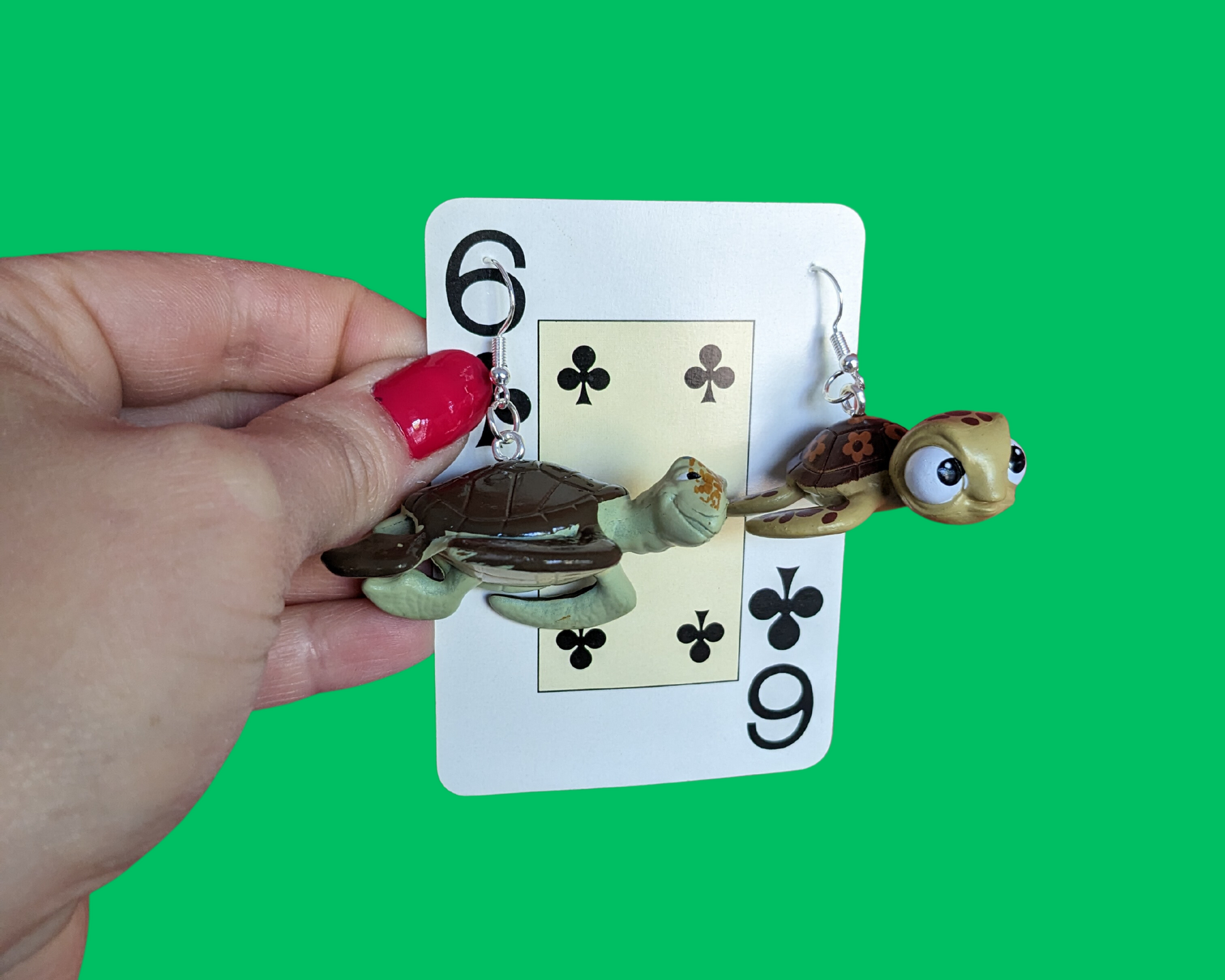 • Handmade, upcycled Pixar Finding Nemo's Crush and Squirt earrings. These were made with small toys.