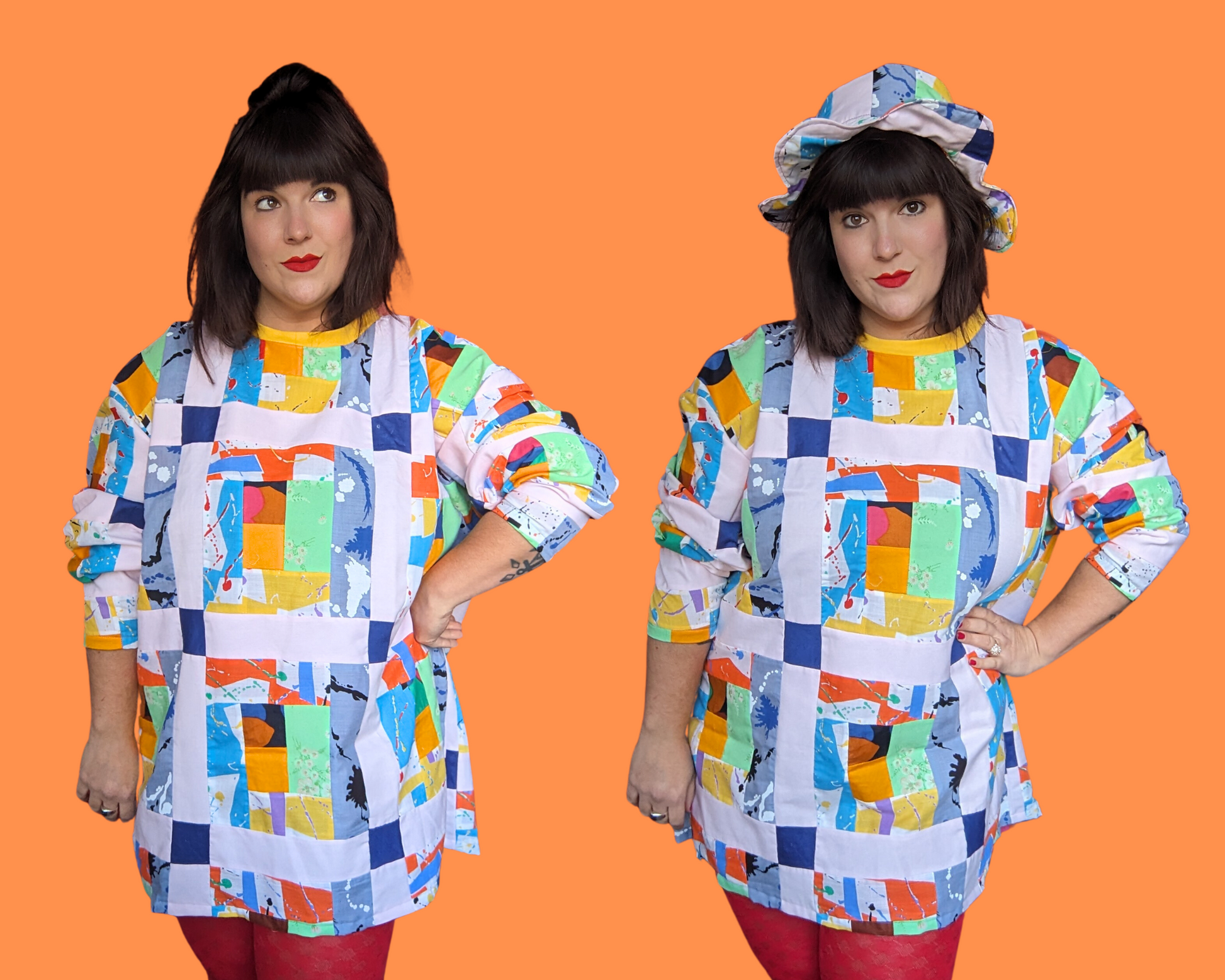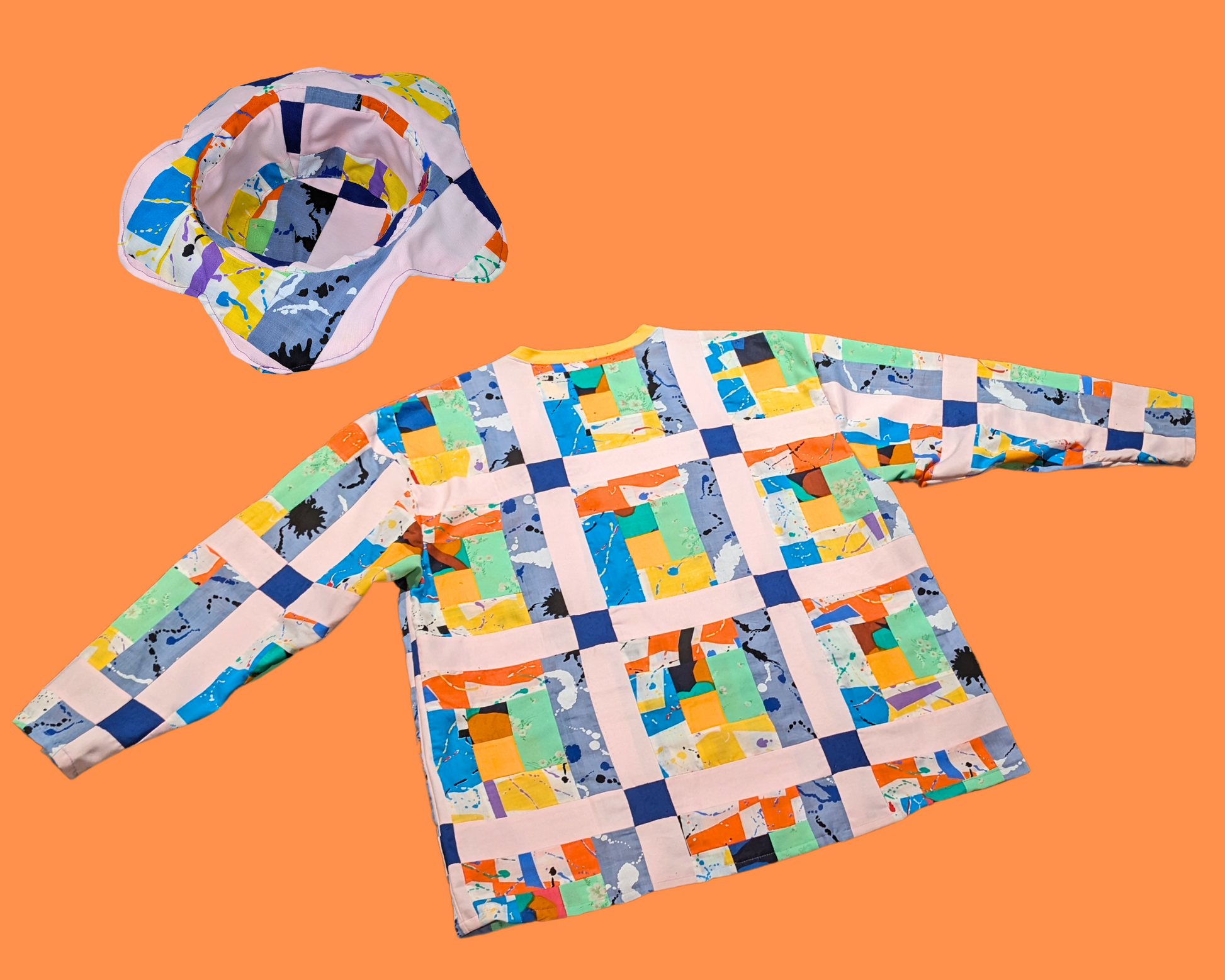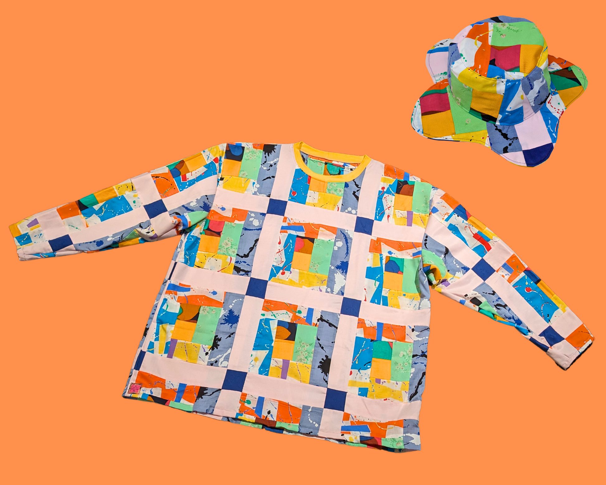 Handmade, Upcycled Quilt Sweater with Matching Flower Bucket Hat Oversized XL