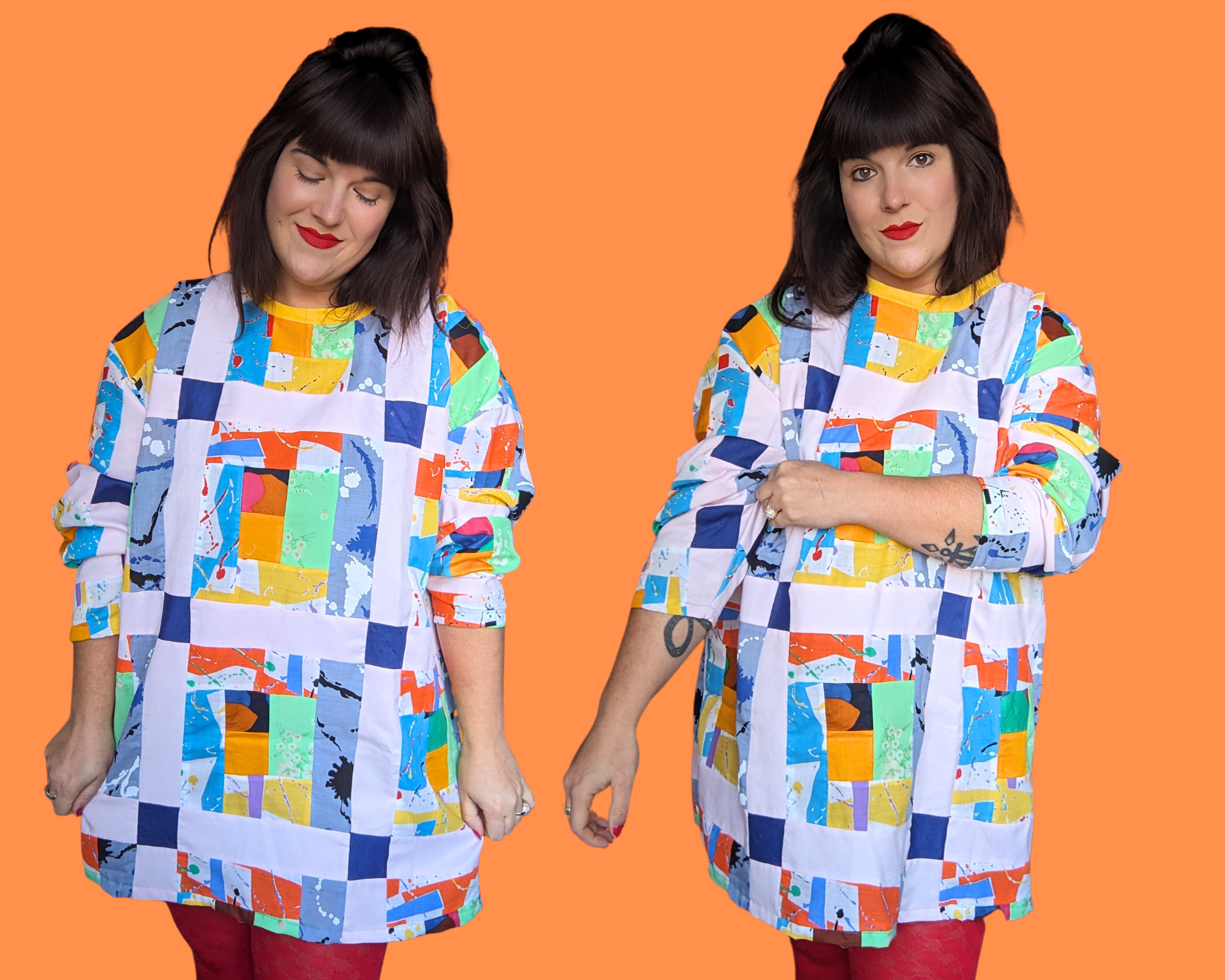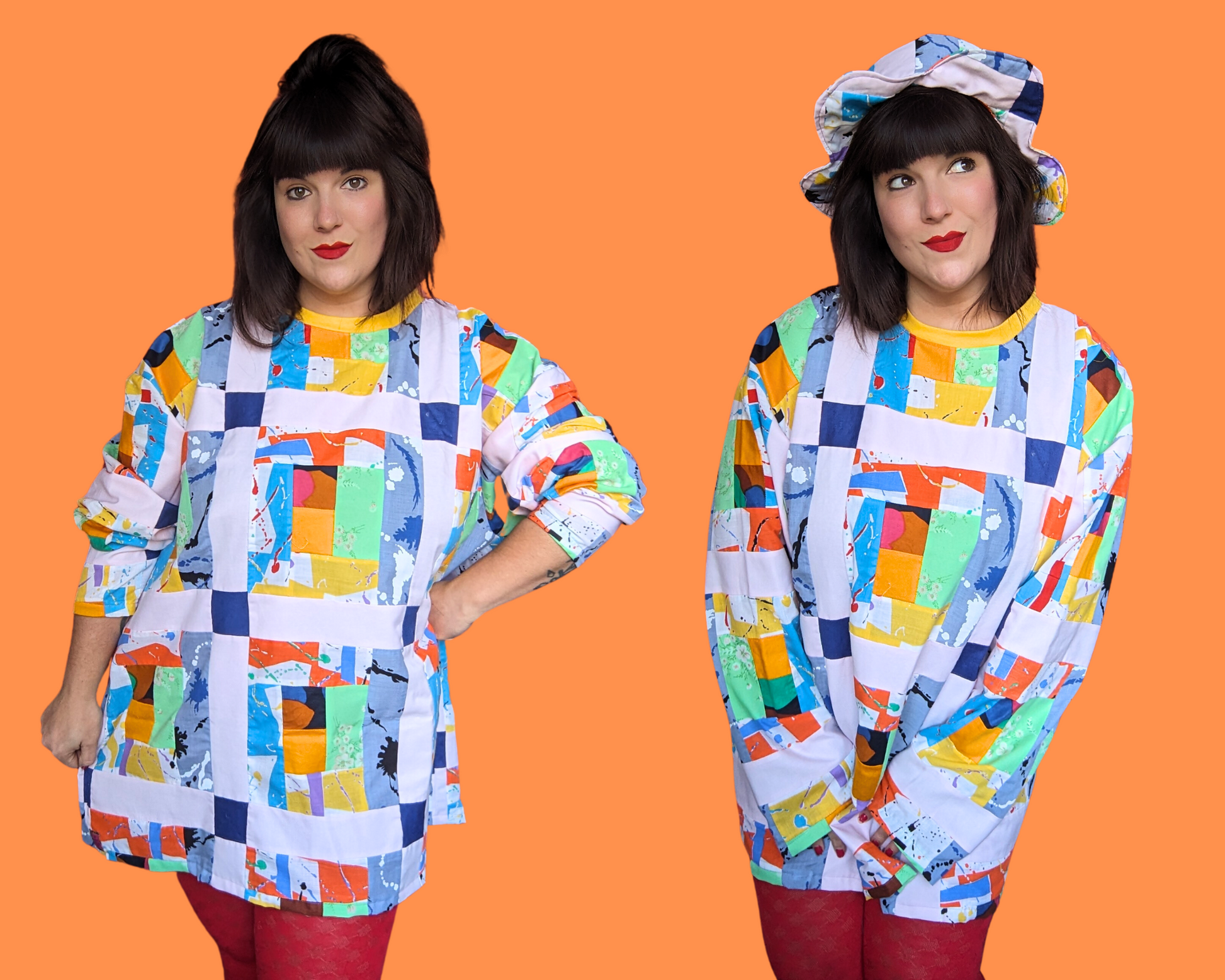 • Handmade, Upcycled Quilt Sweater with Matching Flower Bucket Hat Oversized XL