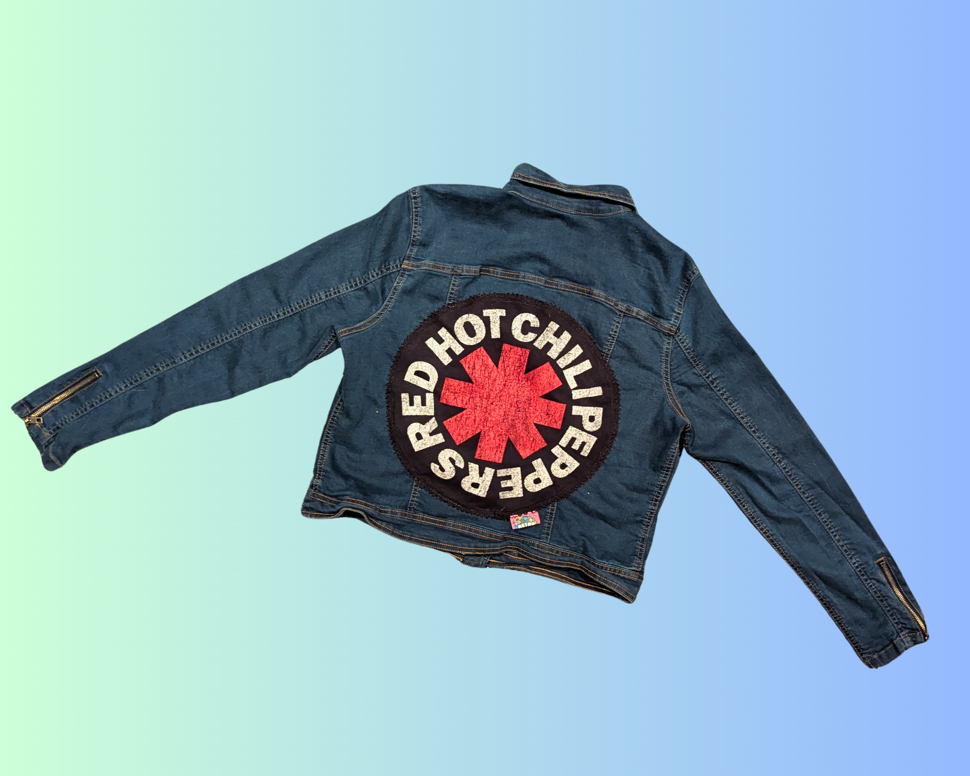 • Handmade, Upcycled Red Hot Chilli Peppers Denim Jacket Size L