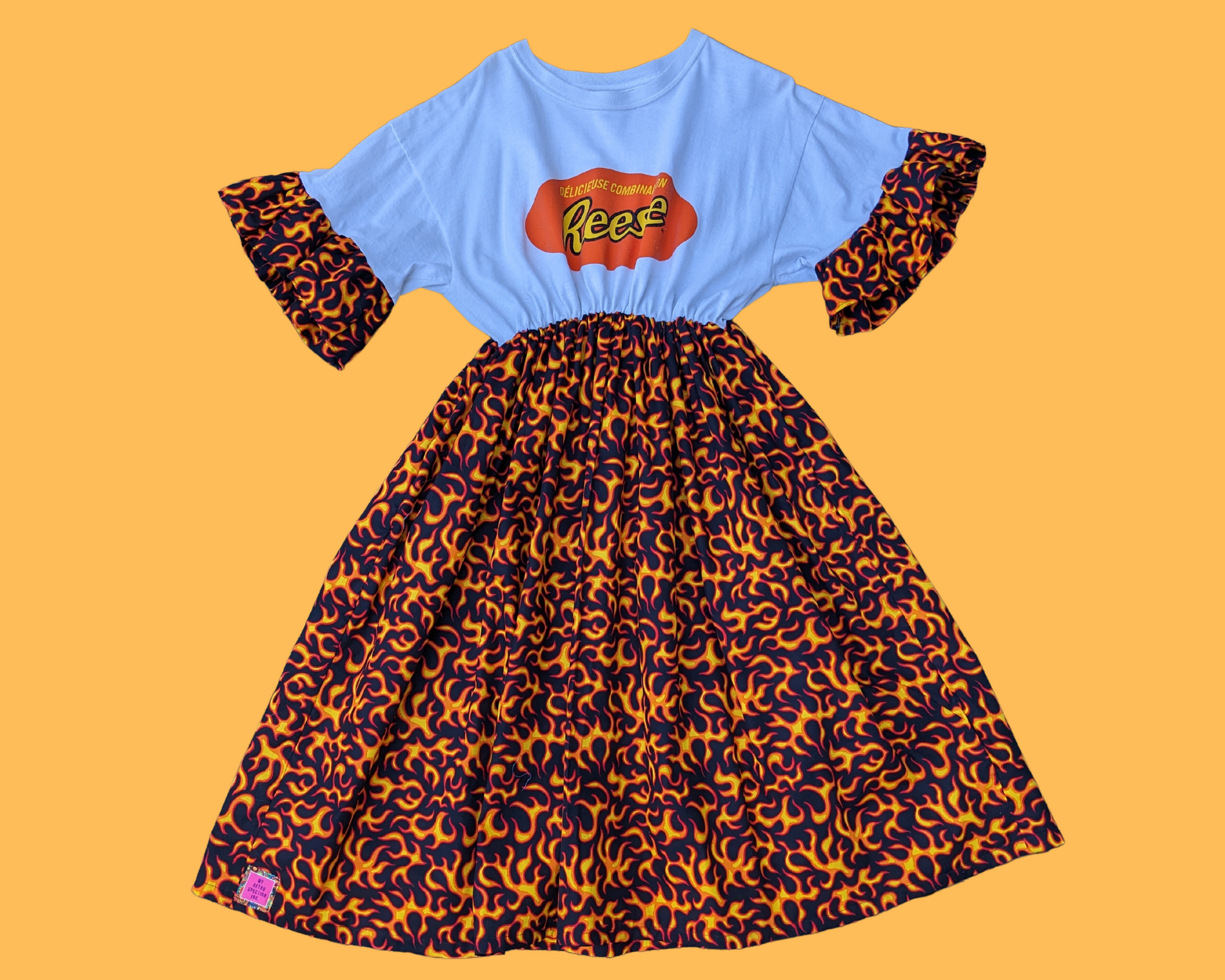 • Handmade, Upcycled Reese T-Shirt Dress with Flames Patterned Fabric Size L
