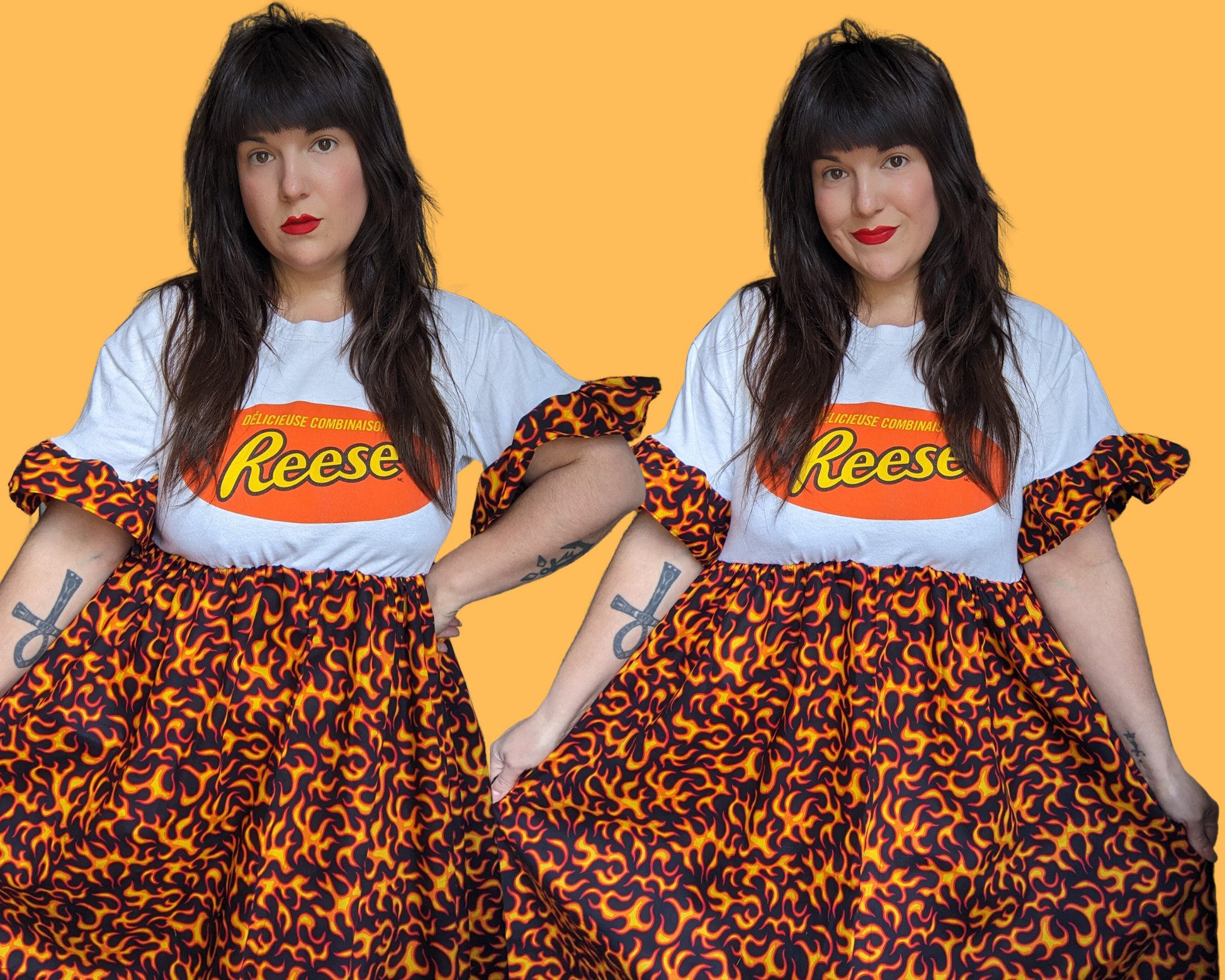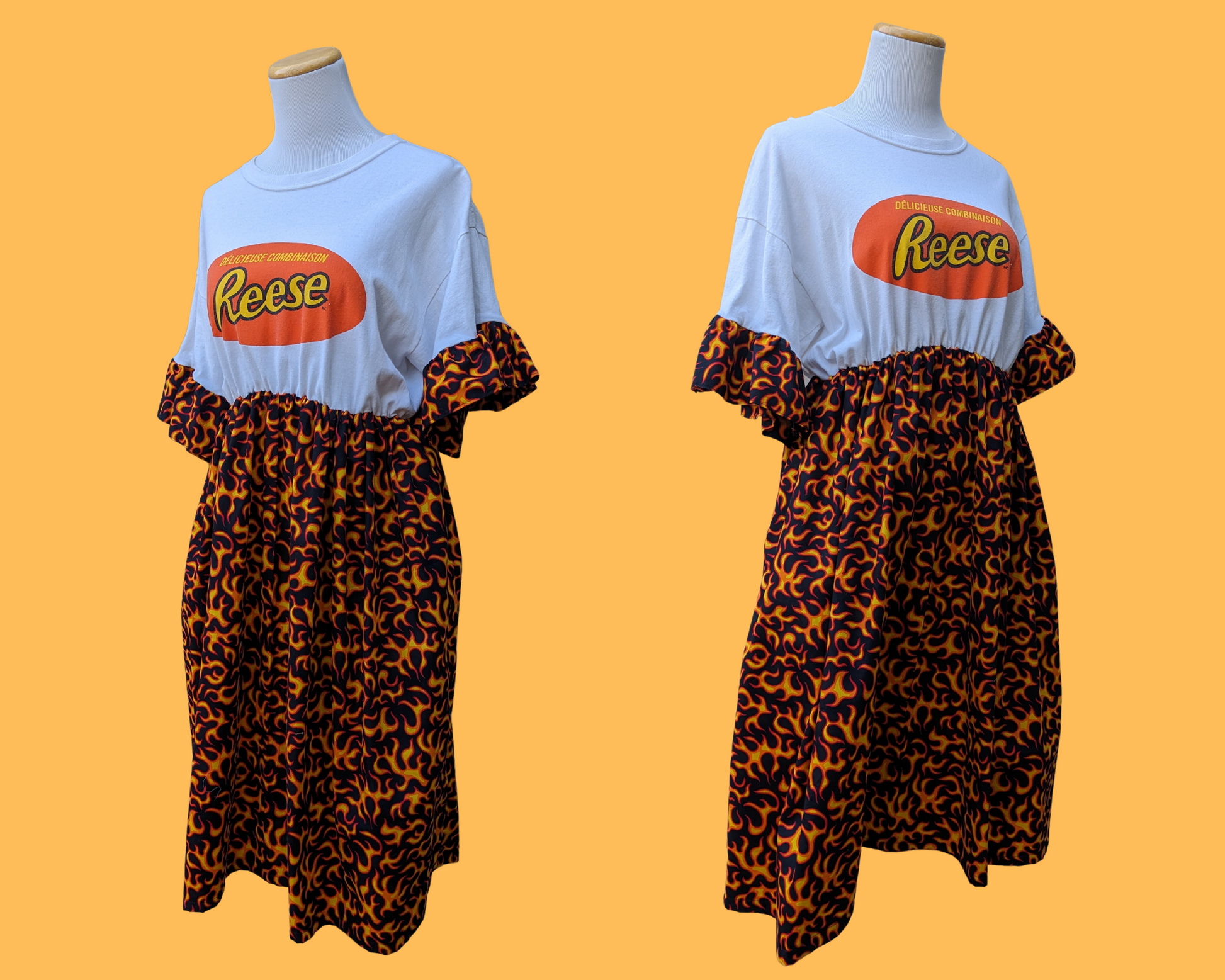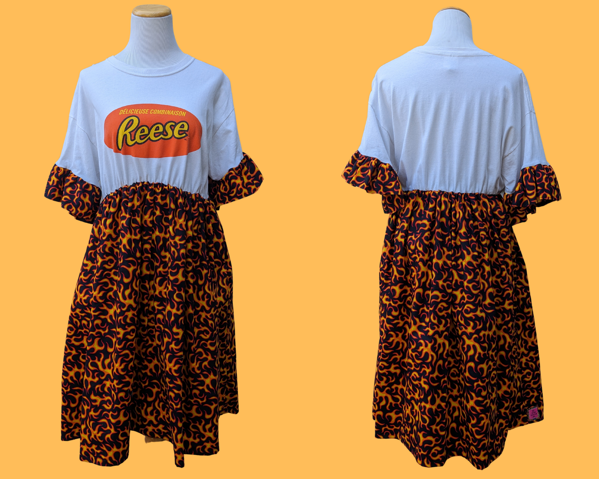 Handmade, Upcycled Reese T-Shirt Dress with Flames Patterned Fabric Size L