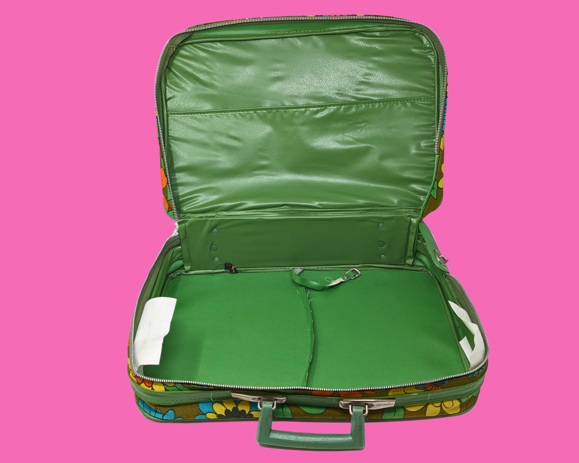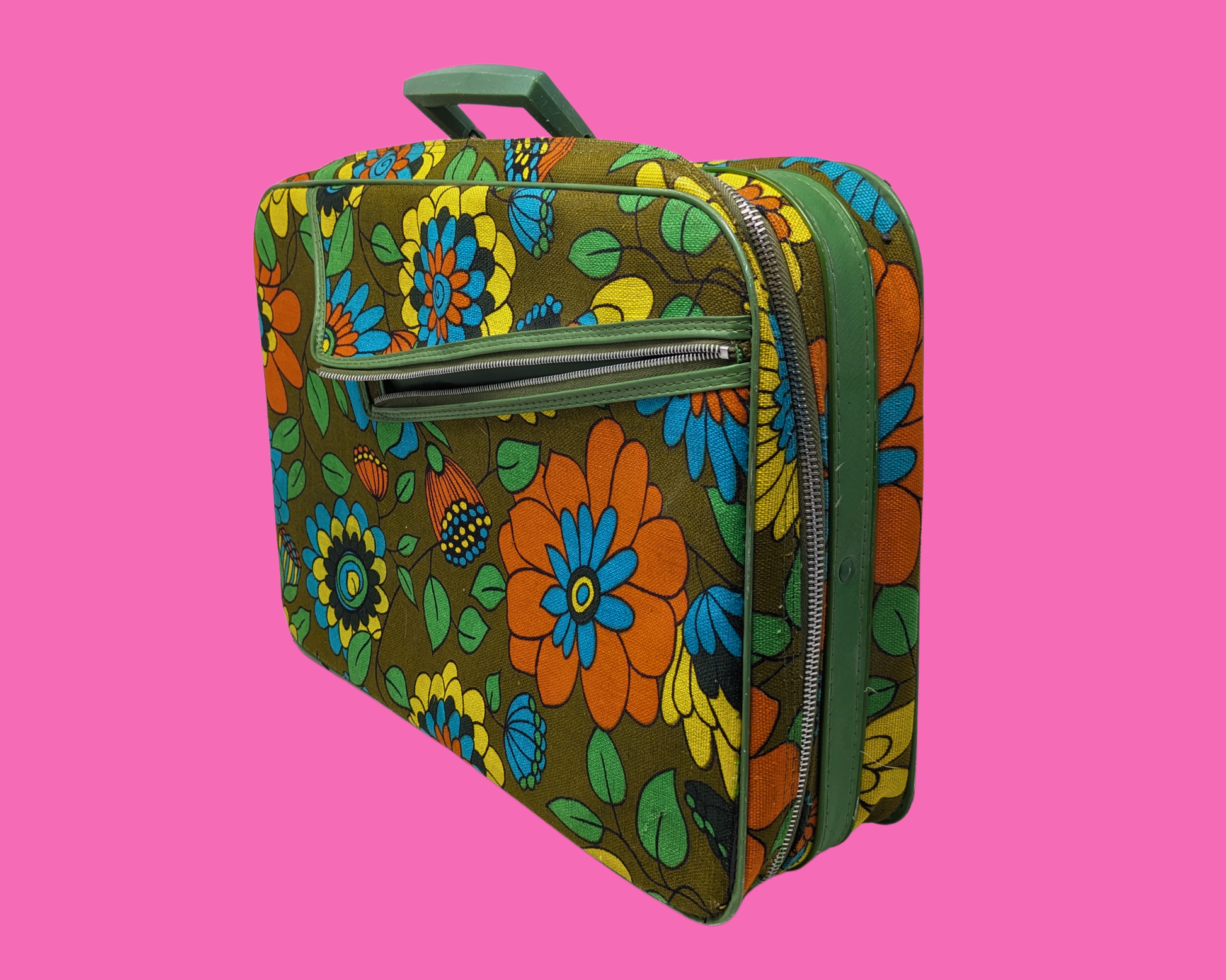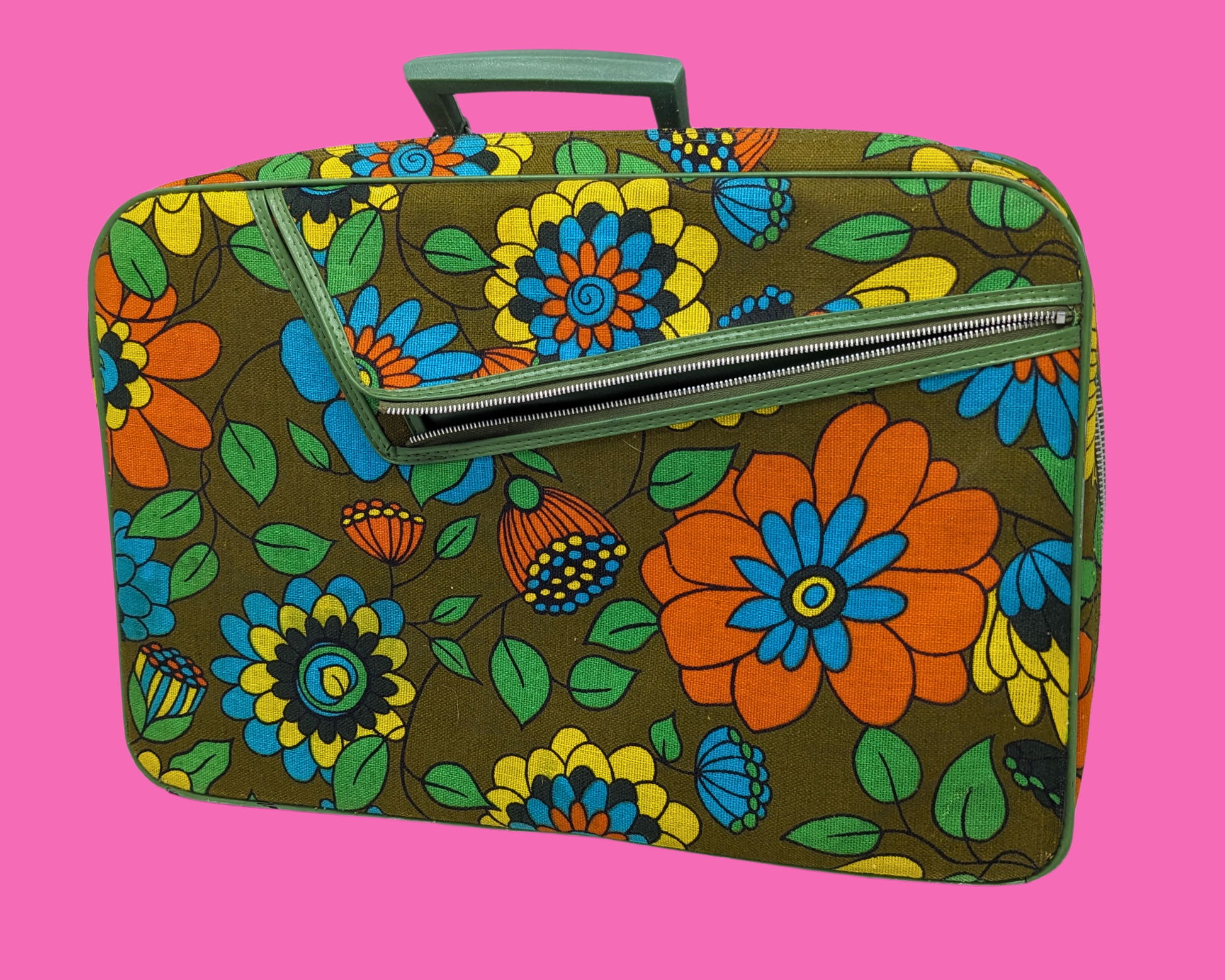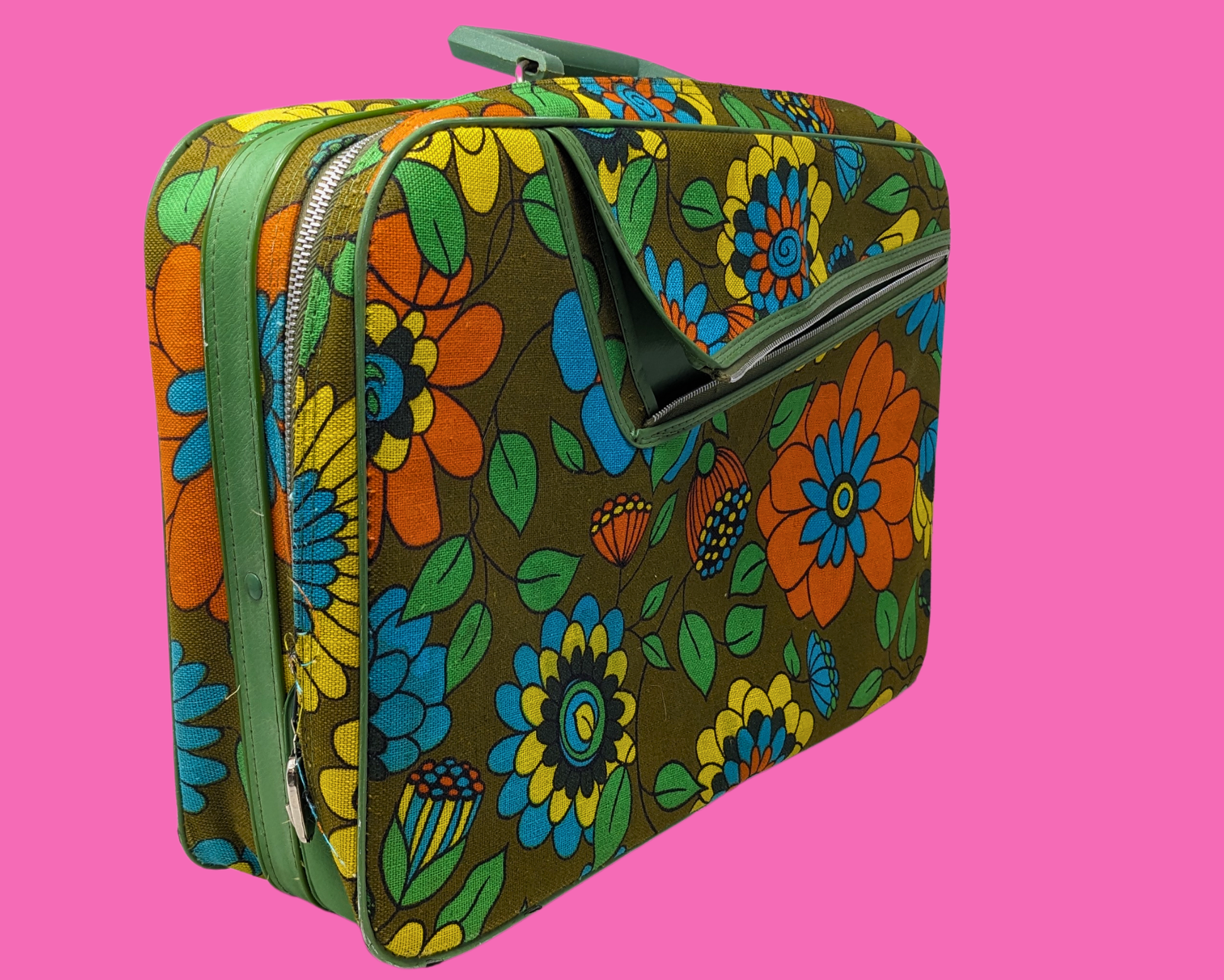 • Vintage 1960's Green, Orange, Blue, Yellow Floral Groovy Small Suitcase