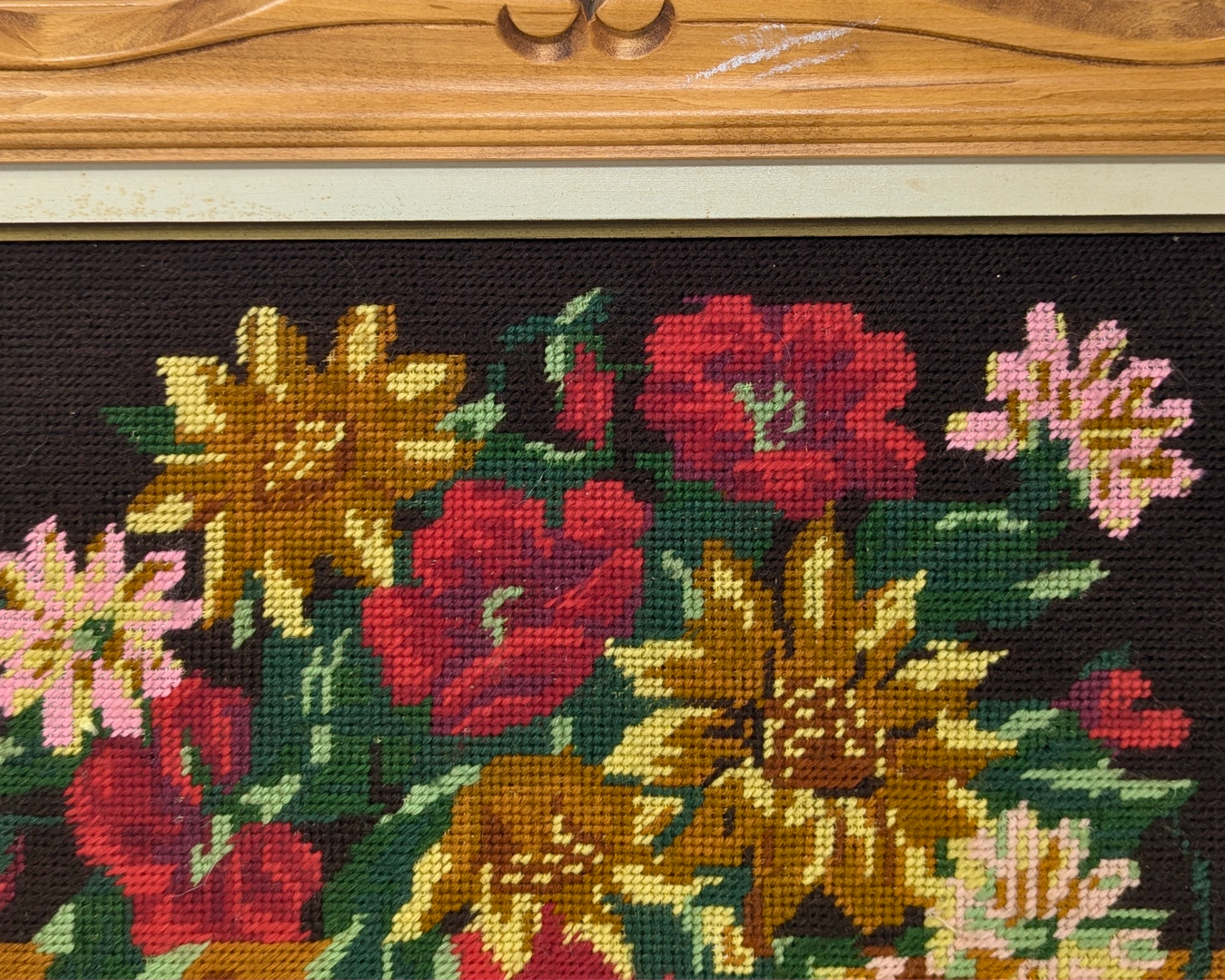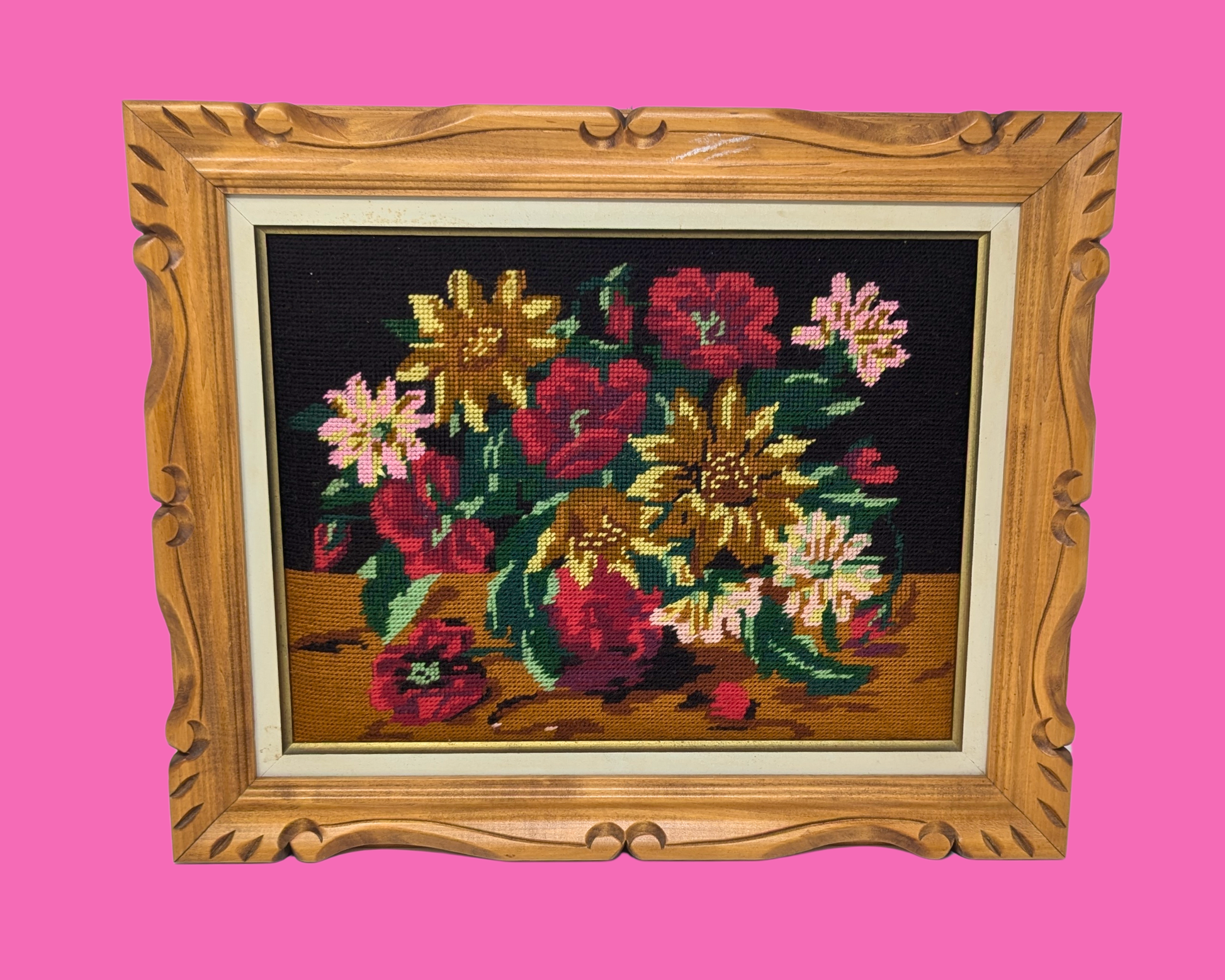 • Vintage 1980's Needle Point Flowers Framed Artwork