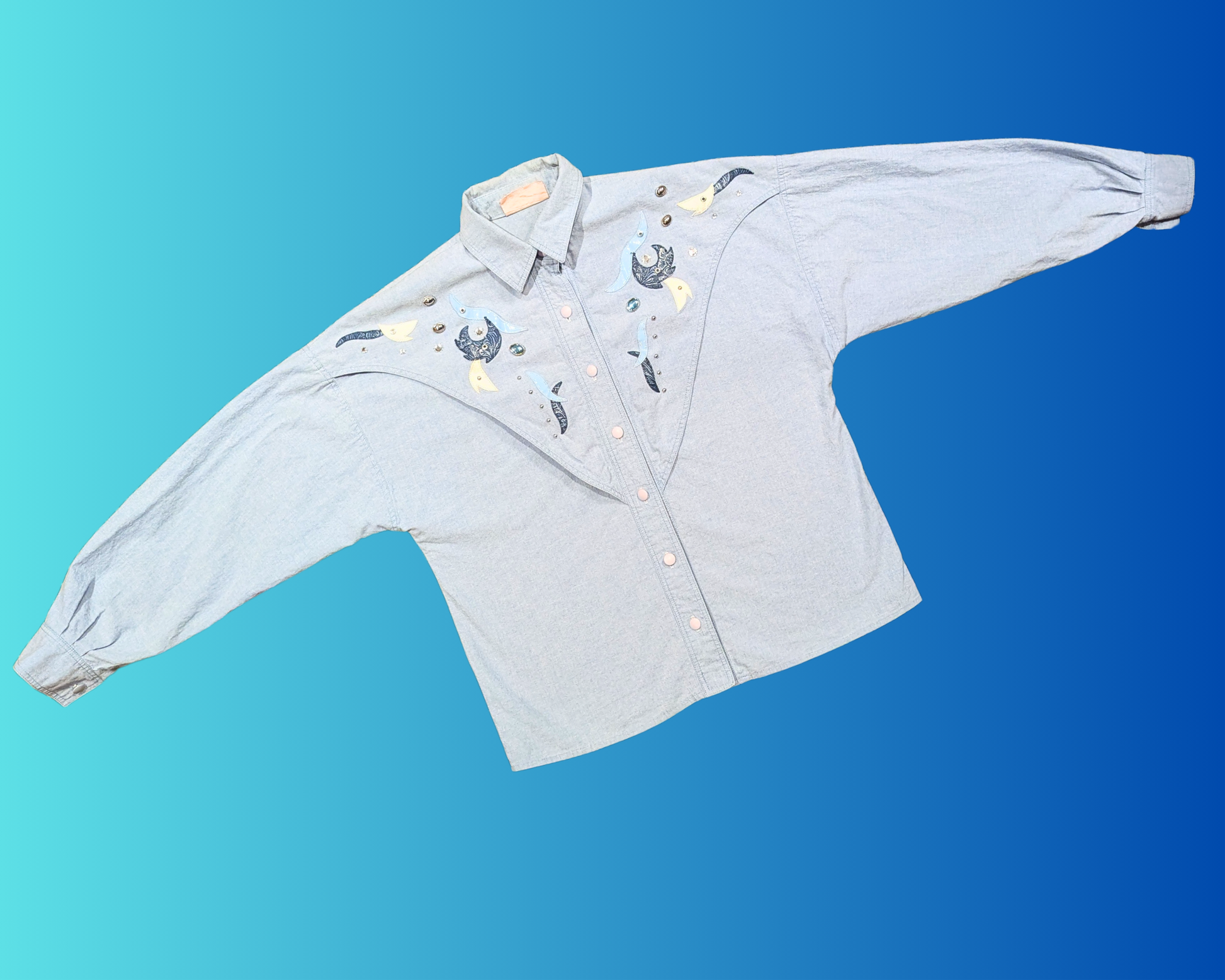 Vintage 1990's Denim Button Down Shirt with Beads Size M
