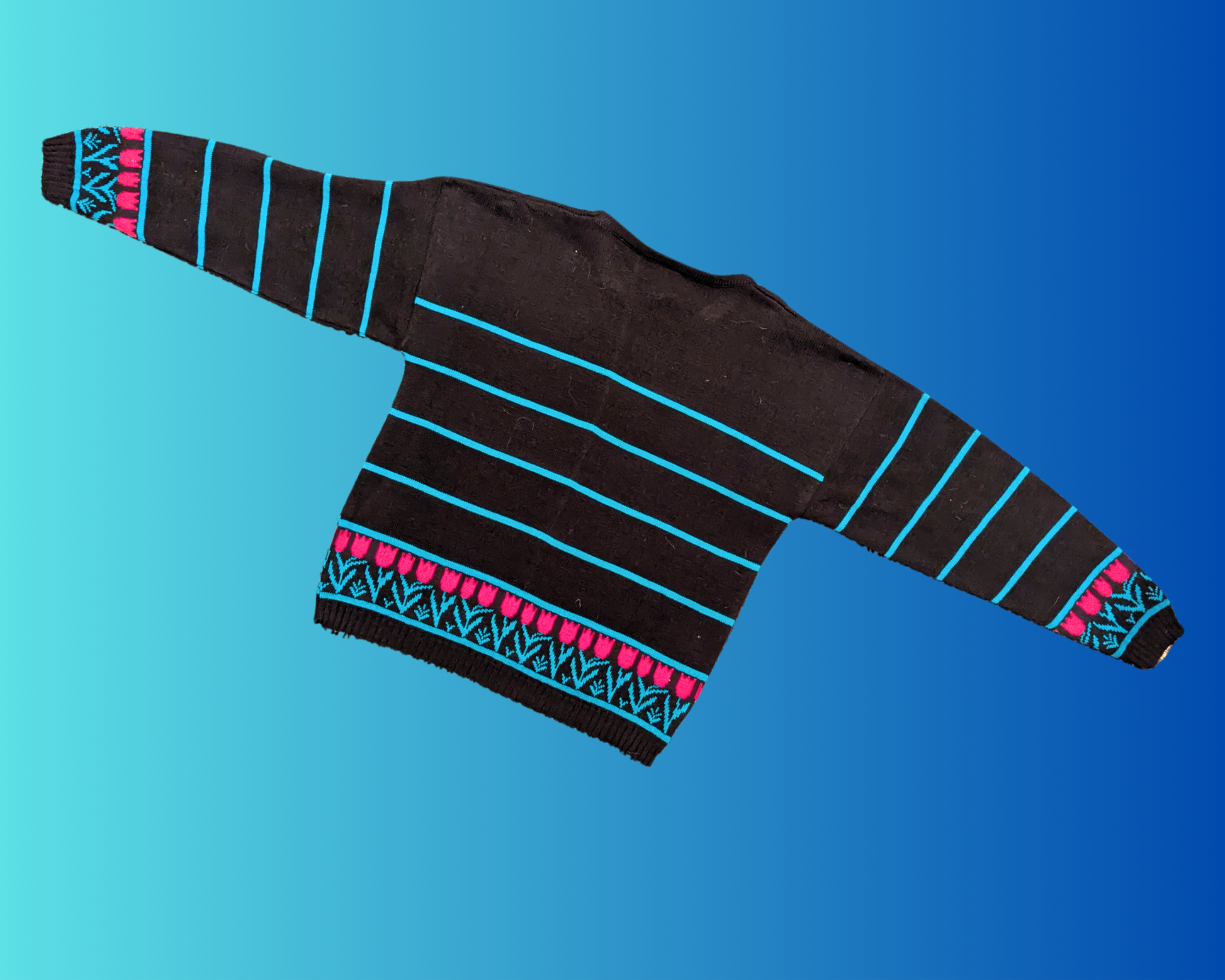 • Vintage 1990's Knit Sweater, Blue Stripes and Pink Tulips, by Sears Tradition Size M