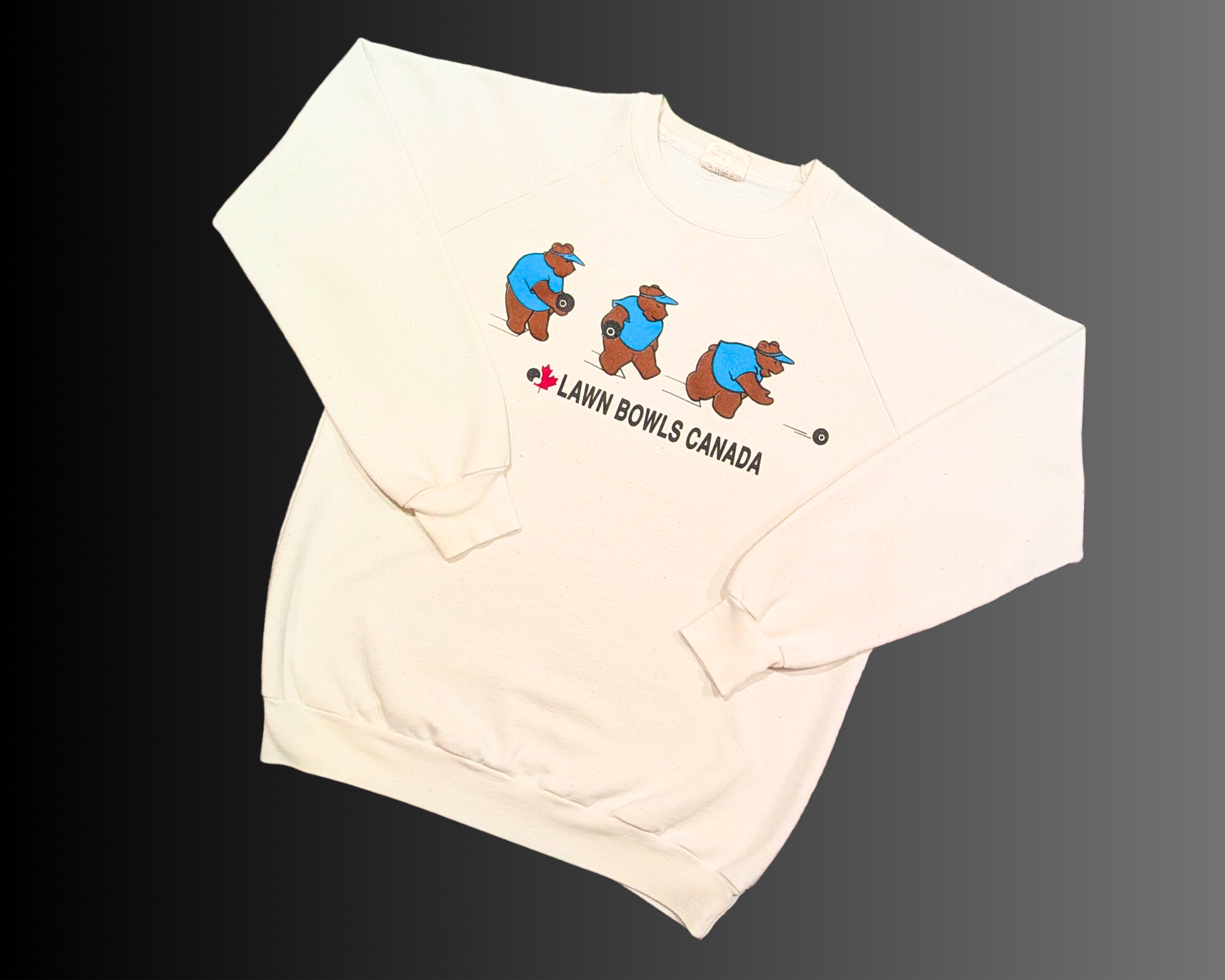 • Vintage 1990's Lawn Bowls Canada, Bears Playing Bowling, White Crewneck Size M